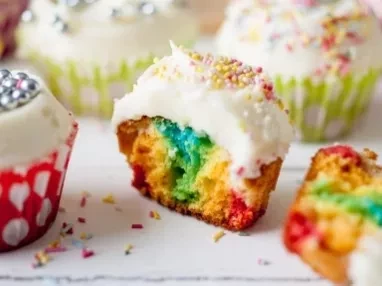 These colourful cupcakes are easier than you might think. They start with one basic batter that's divided evenly into six separate bowls. Each bowl gets a a bit of food colouring, creating all the colours of the rainbow.