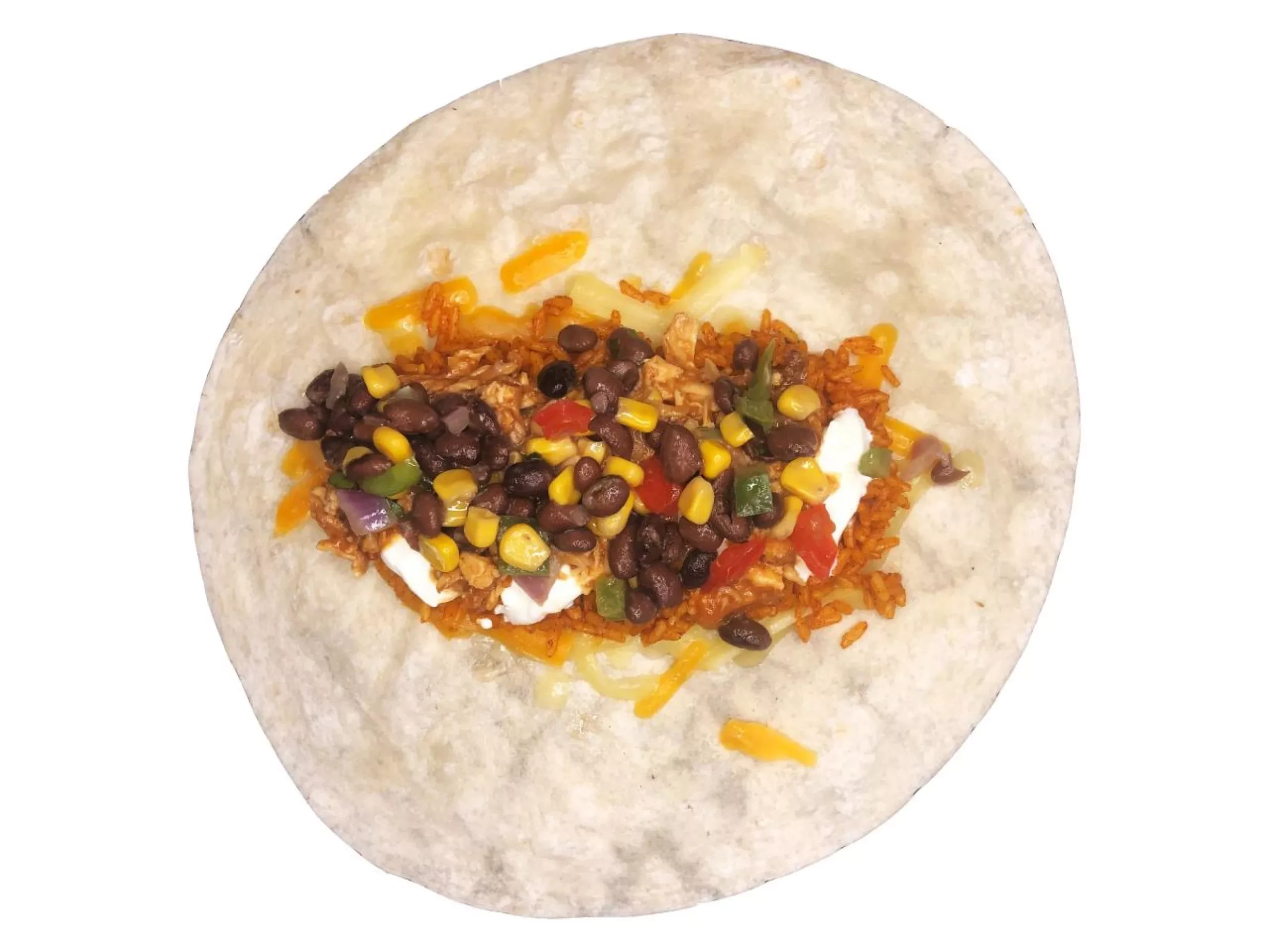 A large flour tortilla is your best bet. That’s because it’s the most stretchy option you can buy, meaning you can load it up with ingredients and it’ll expand to accommodate them — rather than cracking and breaking.