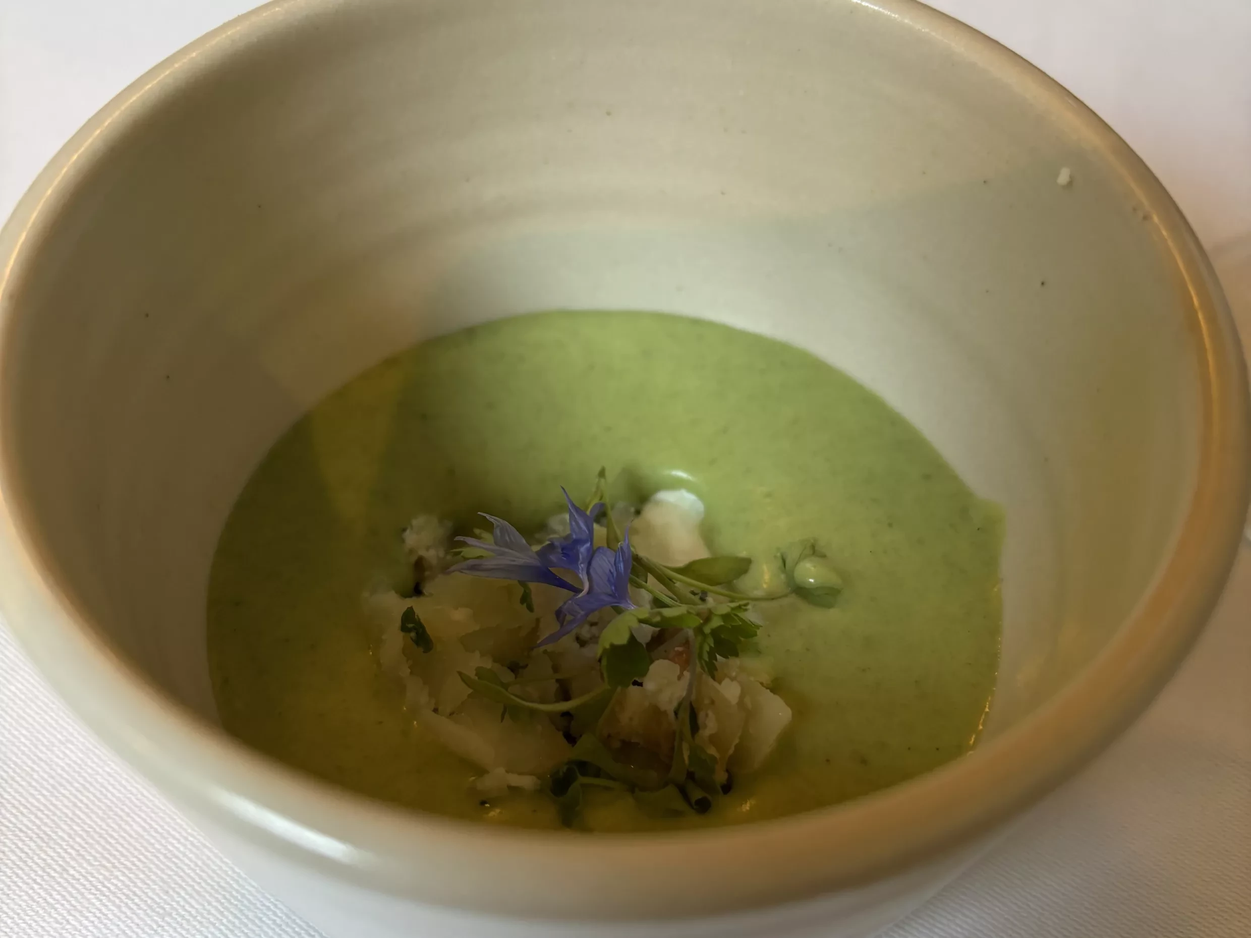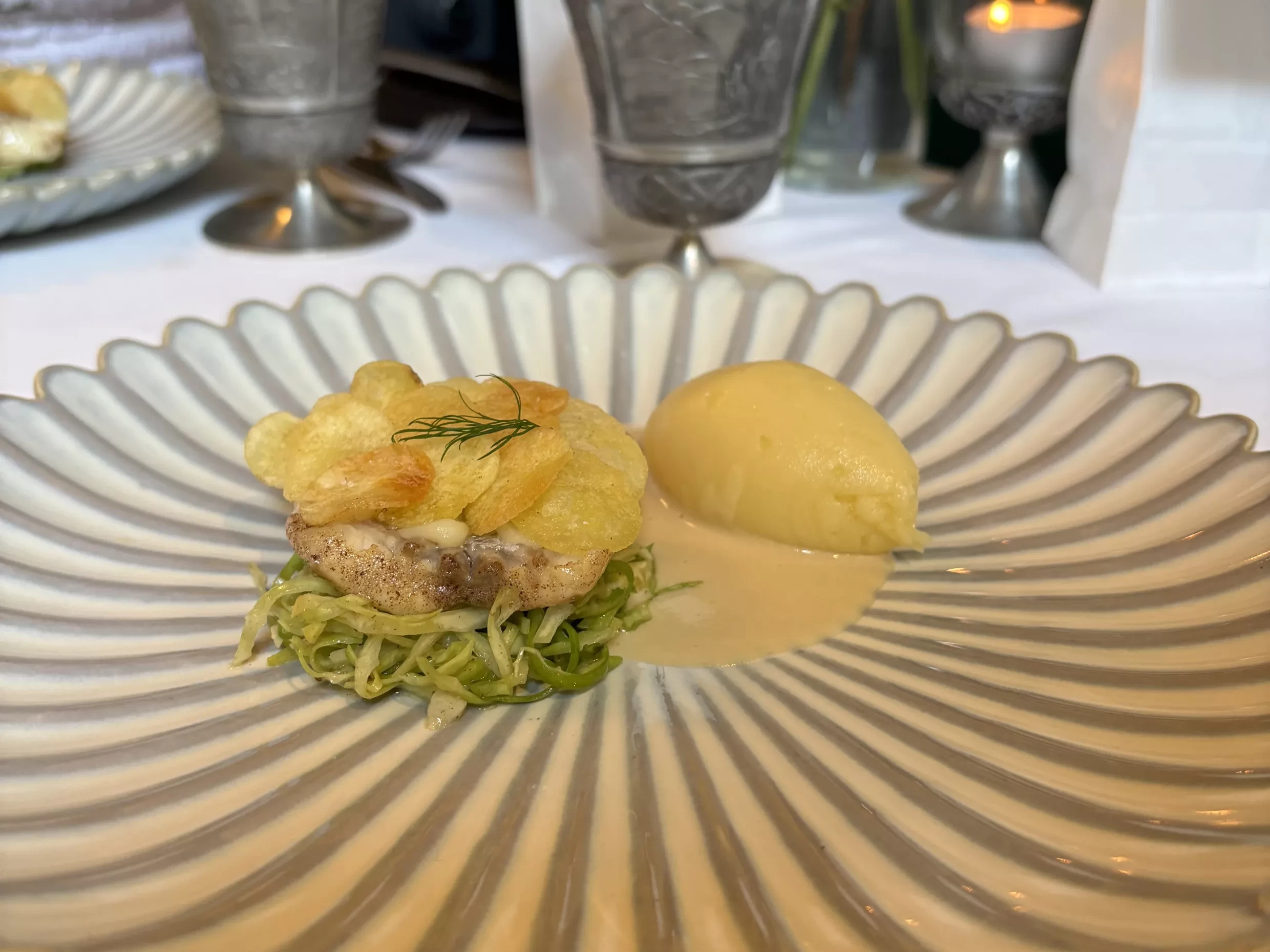The Bia Beag, (an Irish take on an amuse bouche) was a nectar-thick cream of pasteurised goats cheese from St Tola, potato, and leek. Presented as a vibrant green dish garnished with a dainty blue borage flower, the taste was as beautiful as its aesthetic. What briskly followed was an impressive looking assortment of Clonakilty black pudding coated in a crisp potato skin, served with a barley, pecan medley and an apple purée.
