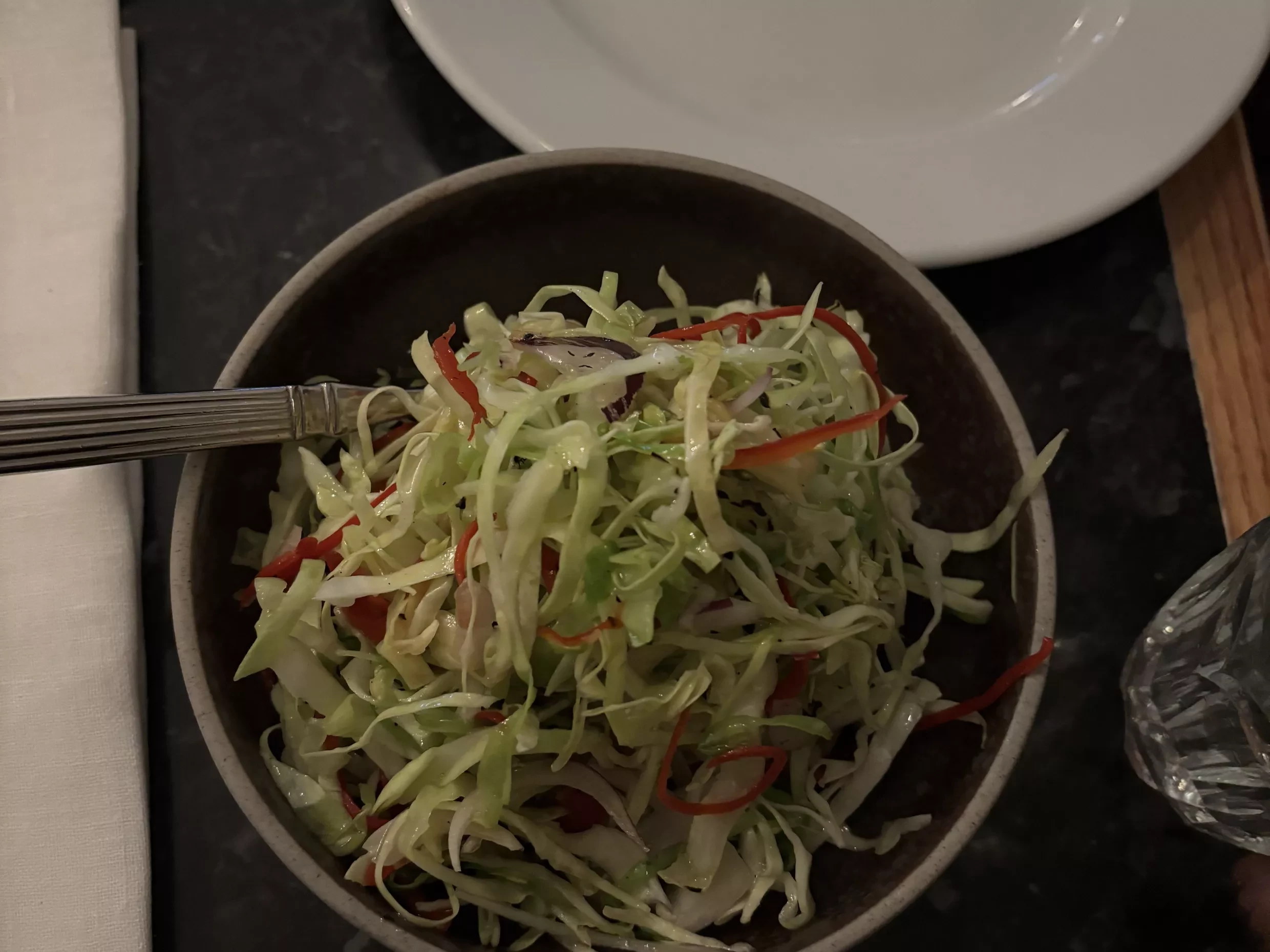 And so, we begin our meal with the hispi cabbage and stone bass crudo. The cabbage tastes refreshing and clean, as though as it has been pulled fresh that day. It has- the restaurant has its very own rooftop garden where the vegetables are grown. It is served with chilli, red onion, and pine nuts, a medley of flavours that combine seamlessly. The wonderfully meaty stone bass lay in a pool of vibrant, zesty "chile water", and was hidden under a delicate layer of pickled kholrabi. Another deliciously refreshing dish with clean, sweet notes, cleared in a matter of minutes.
