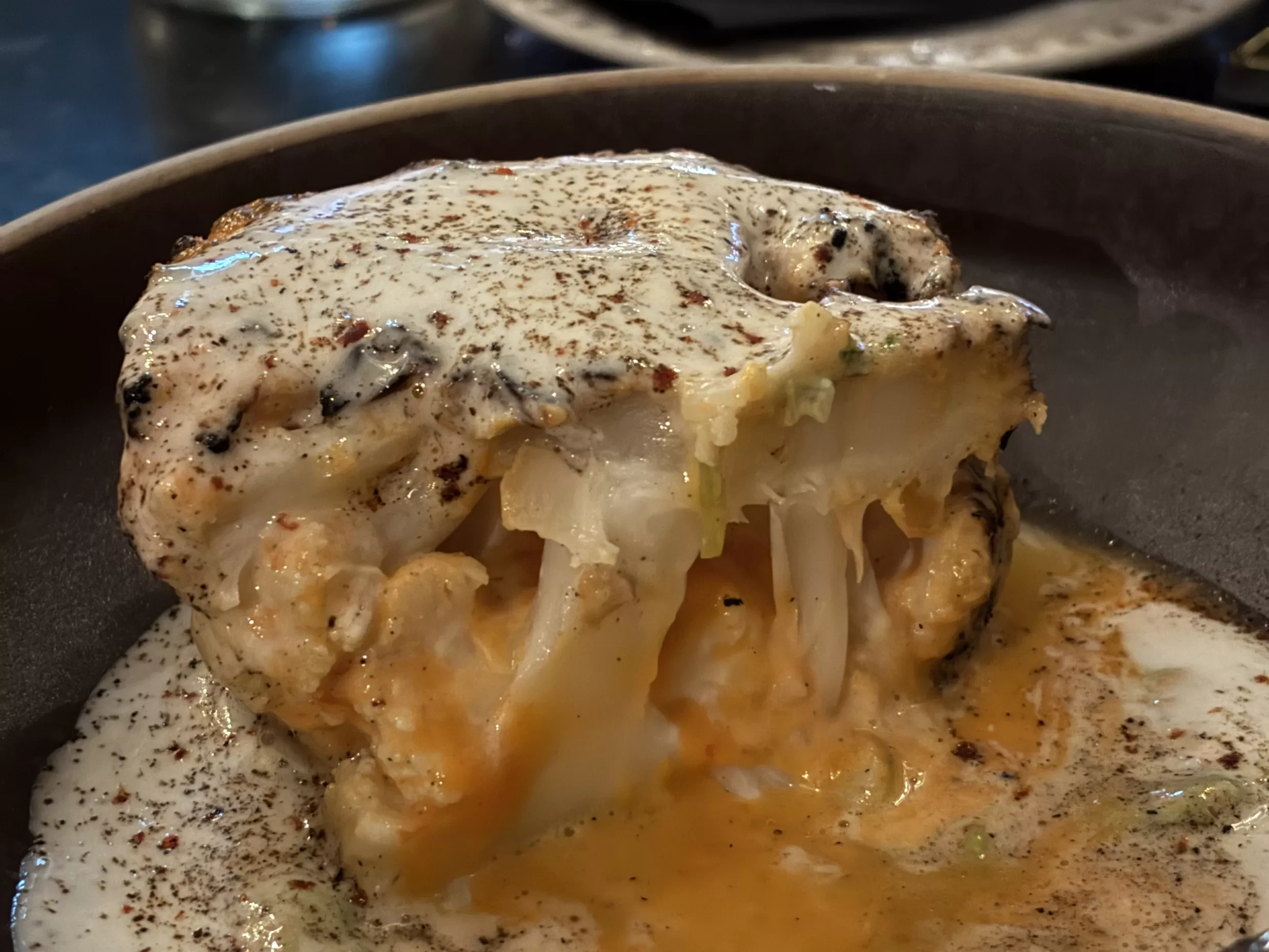 Moving on to the larger plates, the charred cauliflower arrives first. When studying the menu (admittedly a few days prior), this was a dish we overlooked. How good can cauliflower be? Turns out, quite phenomenal. It came quite literally drenched in a creamy mixture of hot sauce and whipped parmesan, yet somehow, unbeknownst to us, the florets remained firm and intact, and the crisped cauliflower was still a large component of the flavour profile. The portion was generous, so generous in fact, it took a significant chunk of time to finish. A plate of two boneless chicken thighs followed; succulent, smoked and served with a zesty chimichurrie to cut through the juicy, charred flavours.
