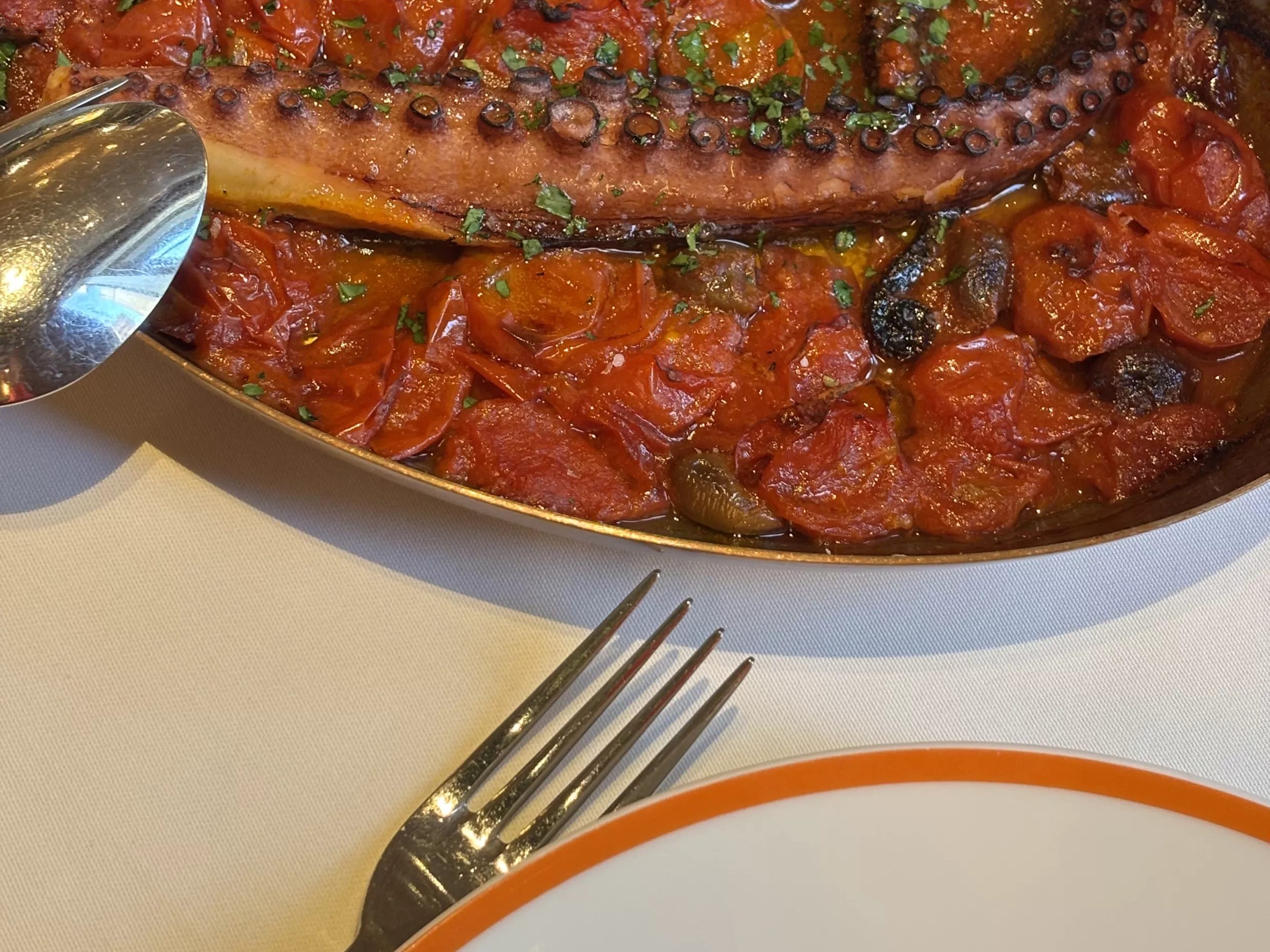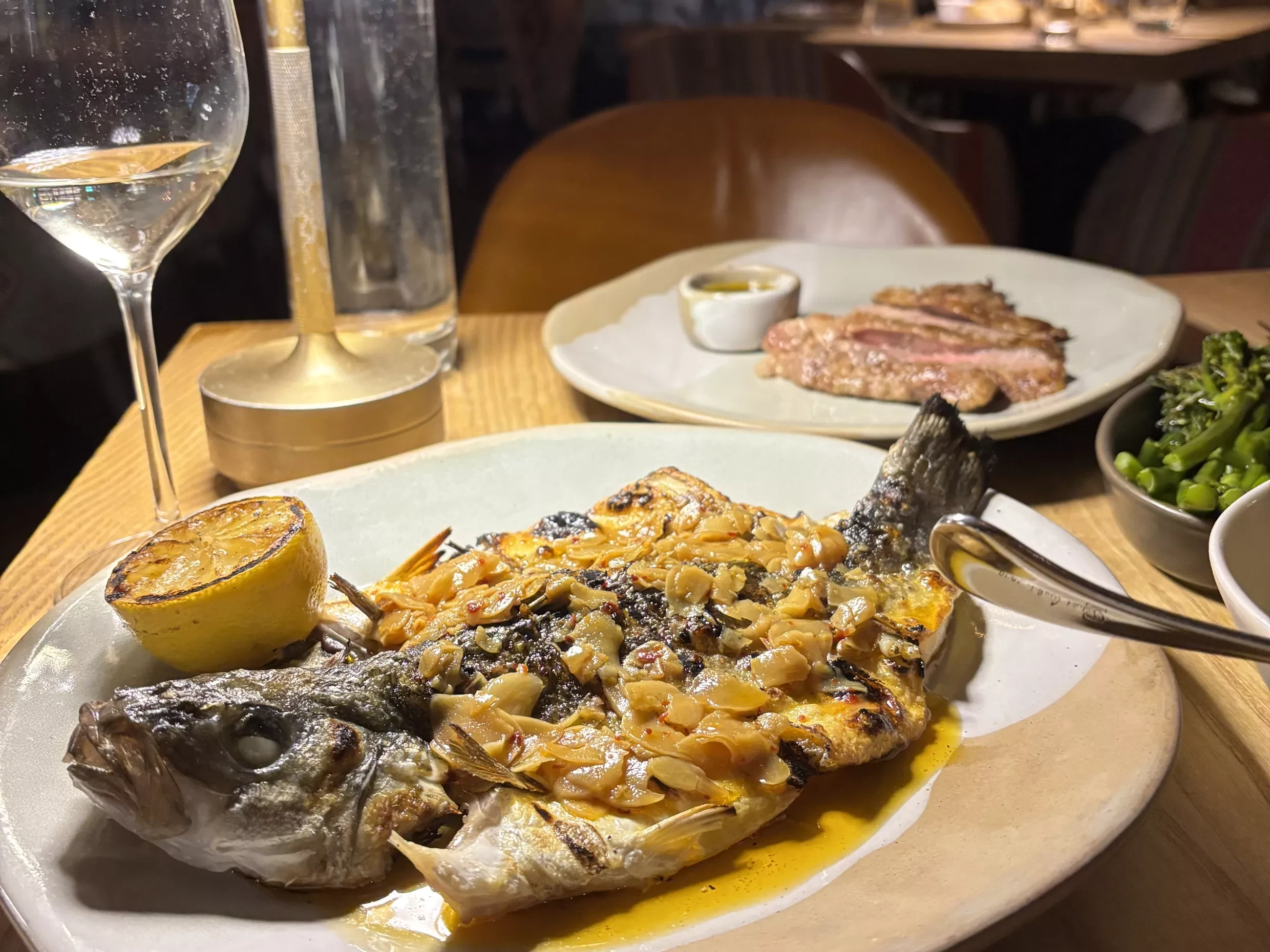 For the main event, we were presented with a whole seabass, served de-boned and perfectly moist. It came in a Bilbaina sauce, a garlic and dried chilli infused oil. The entirety of the skin was covered in finely sliced garlic, giving it a sweet, tasty flavour to complement the kick from the dried chilli.