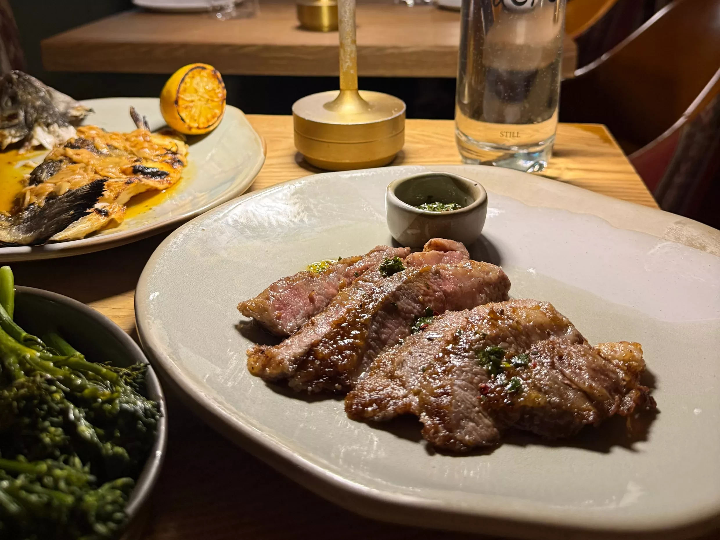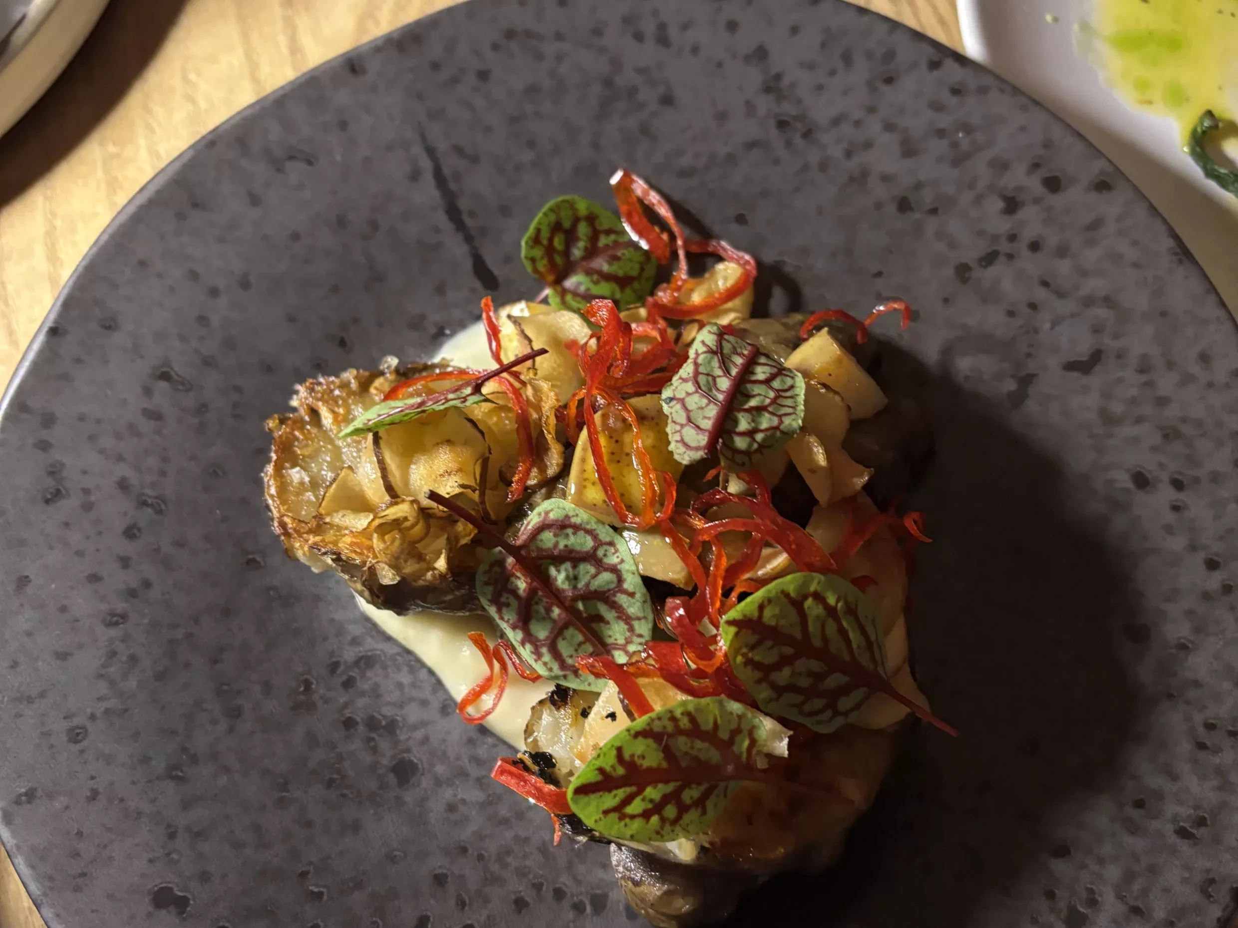 We began with a generous, salty bowl of Padrón peppers sprinkled in za’atar, swiftly followed by our first fire-grilled dish: a skewer of octopus and smoked eel, sat on a bed of borlotti beans and merguez, a tasty lamb sausage made with a kick of spice. Next up was the sea beam tiradito, with aji amarillo, a yellow chili pepper, and a burst of sweetness from clementine. The final addition to our spread of small plates was the Jerusalem artichoke, an immaculately presented dish with pear and sorrel.