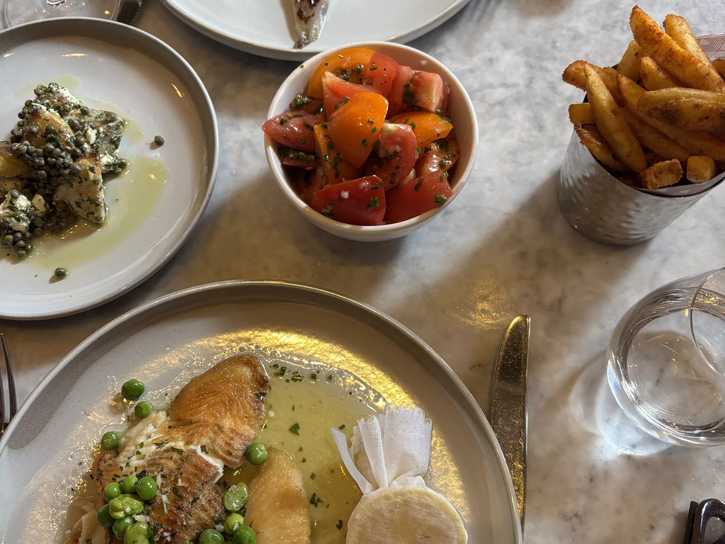 With our plates squeaky clean, we eagerly anticipated our mains, a combination of sea and land. The whole plaice was tender and moist, served off the bone with a medley of peas, broad beans, and a generous pouring of seaweed butter. The juicy rib-eye of Black Angus Grass-Fed Beef was served with roasted Tropea onion, Café de Paris butter, and golden fries. Our sides of choice were a crisp salad of beef heart tomatoes, shallots and chives as well as artichokes, slowly roasted with a dressing of feta cheese, capers, and lemon-parsley olive oil.