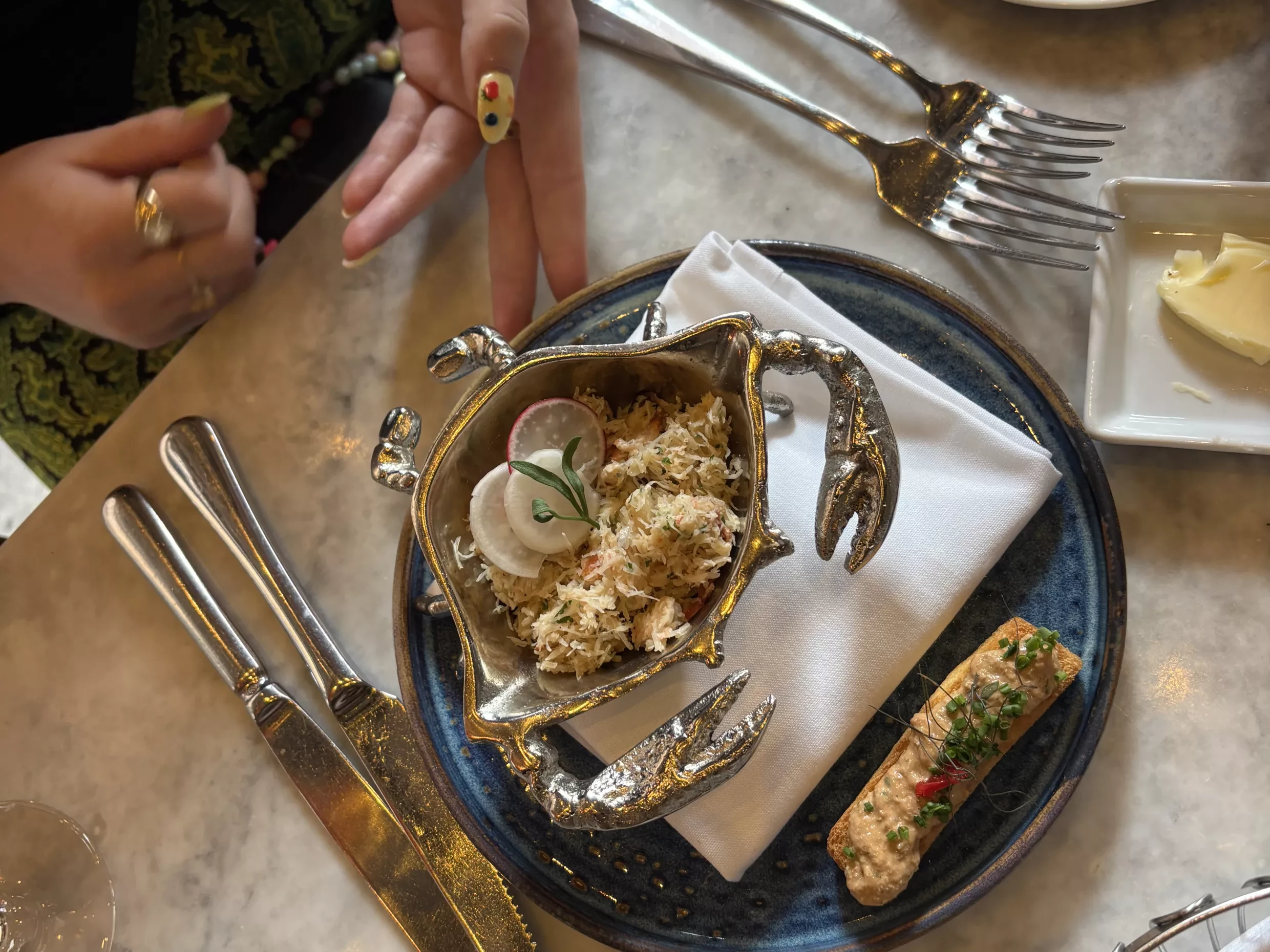Following our aperitif, it was time to tuck into the carefully crafted, seasonal menu of European cuisine with British ingredients. In other words, the reason we were here. To begin, was the hand-picked Devonshire Crab, which to our delight, was opulently served in a stainless steel crab-shaped dish. Our fellow starter of choice was the smoked Scottish Salmon with dill, preserved lemon, and mango, drizzled in a tangy herb dressing. Light, fresh, and leaving a slightly sweet aftertaste, we were confident that our choices were the perfect start to an al fresco dining experience.
