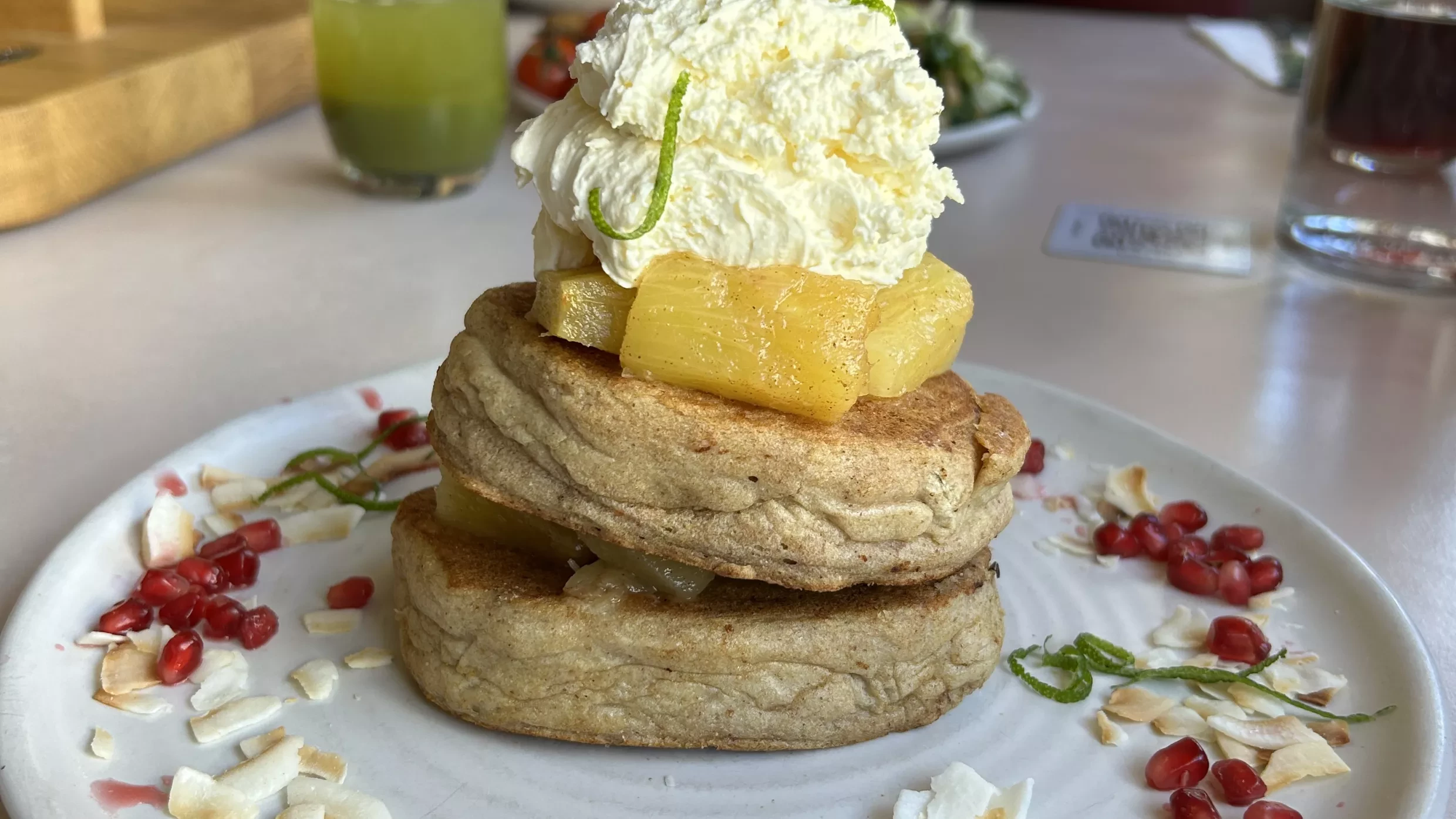 For our Buddha Brunch and Hummingbird plates, we requested the 3-in-1 vegan pancakes that are made with a flour blend of organic rice and buckwheat flour, soy milk & chickpea water. This meant that not only were our pancakes vegan and dairy-free, but gluten-free too. Typically, gluten free pancakes tend to be on the drier side, often flat and crumbly. This is down to the sheer lack of gluten, which acts as a binding agent in flour that gives that fluffy bounce to the batter. However, admittedly to our surprise, these gluten free and vegan pancakes were a sheer delight- light, airy, and the perfect texture, exceeding all expectations for a wheat-free, dairy-free alternative.