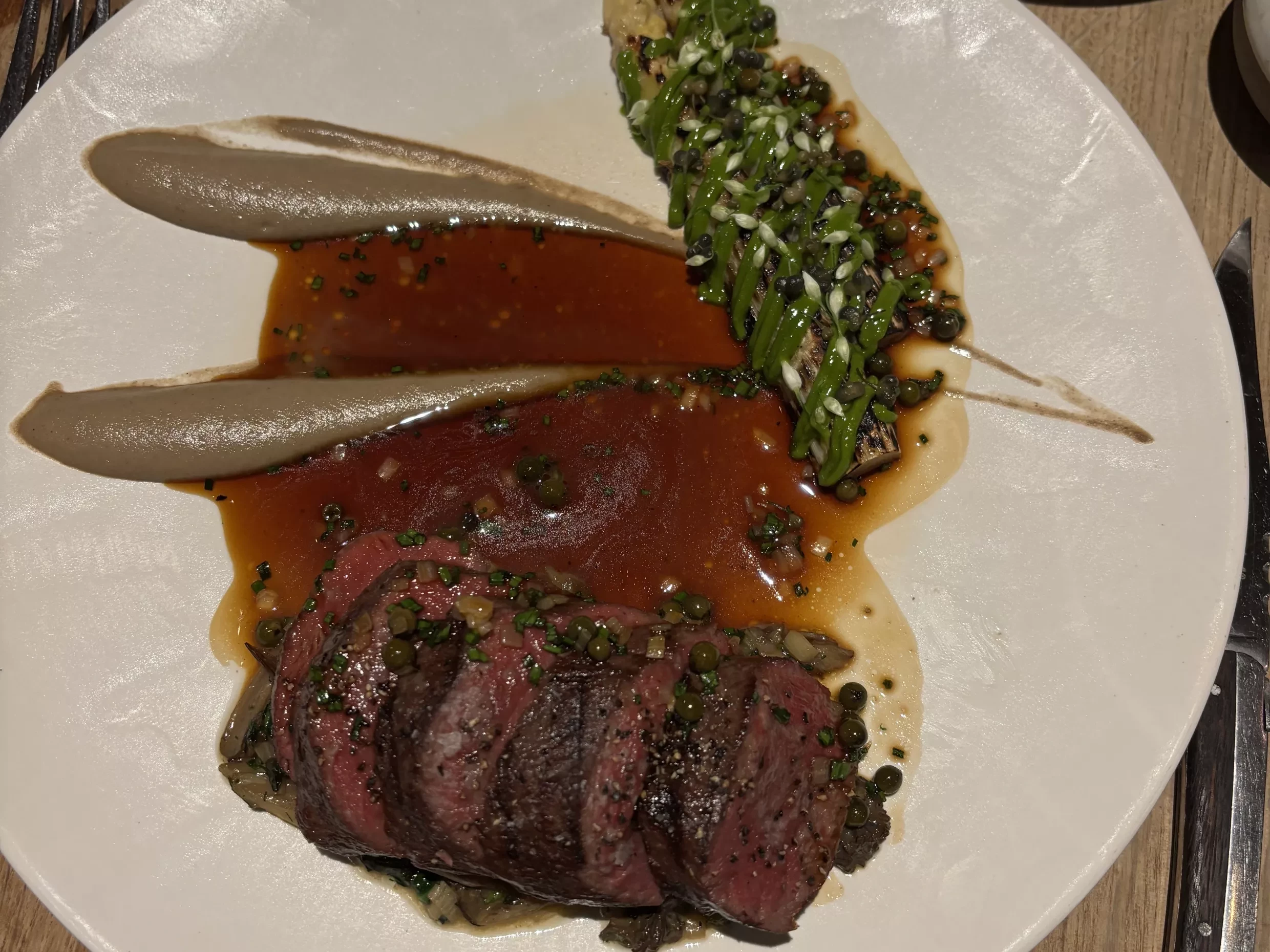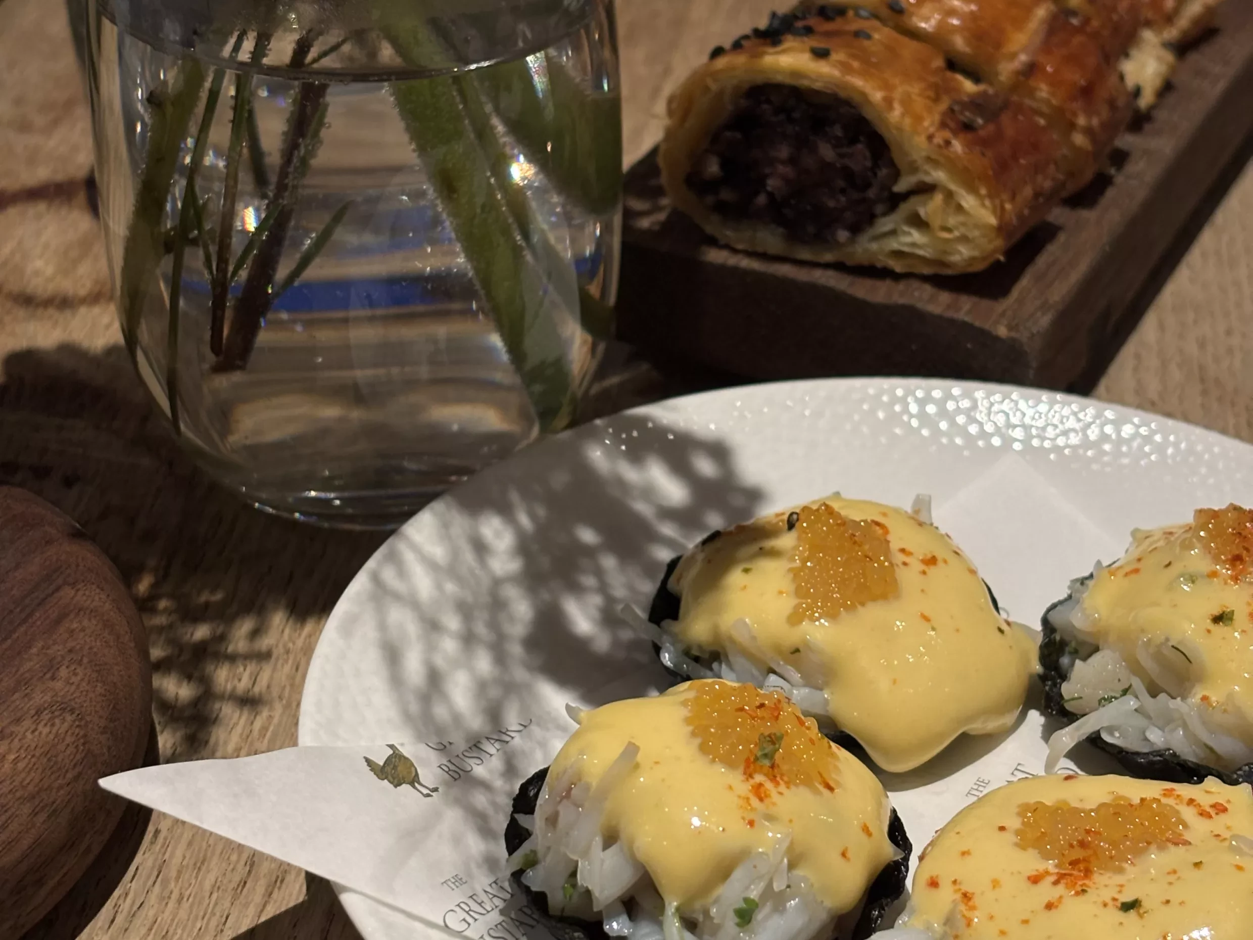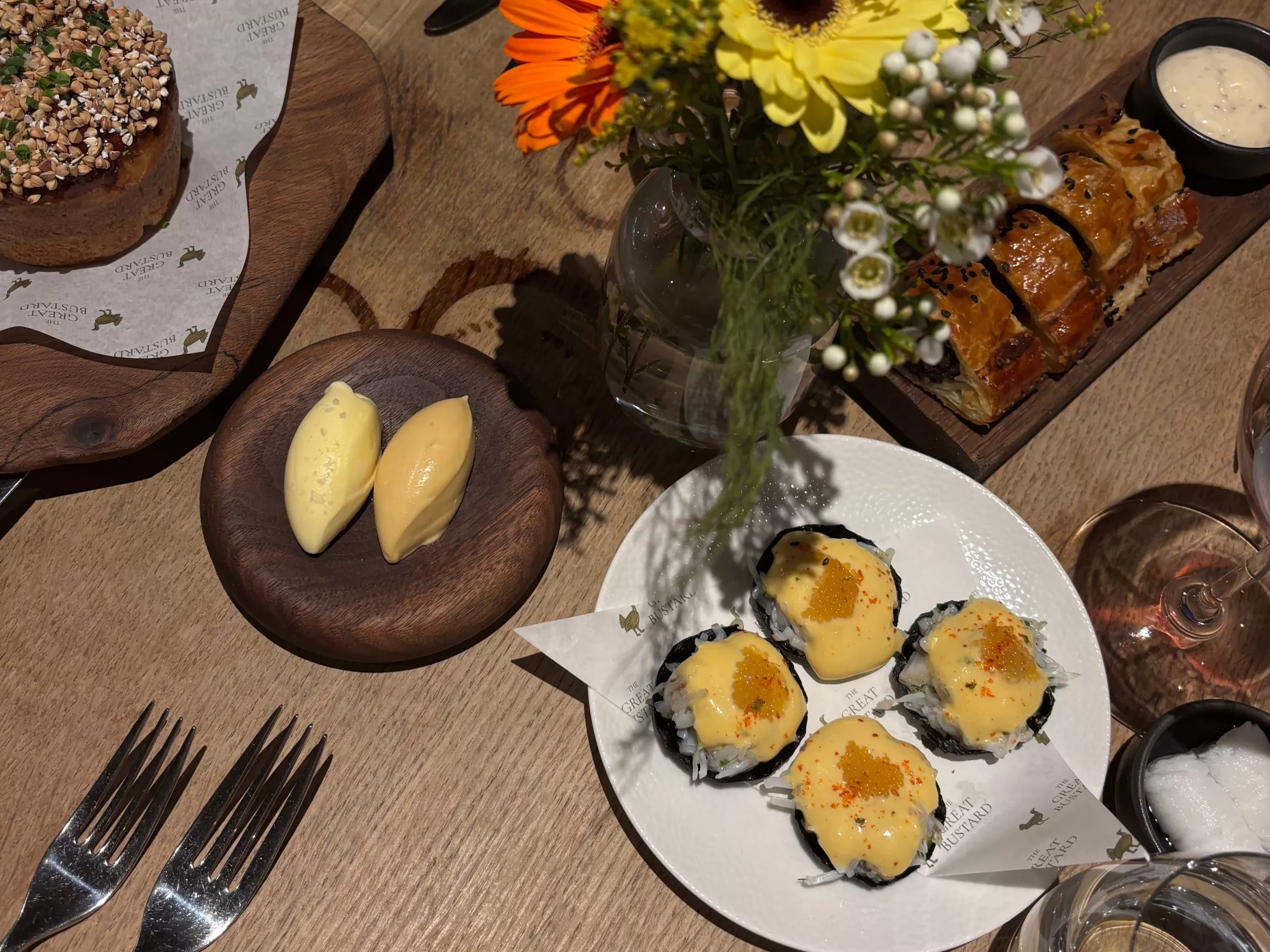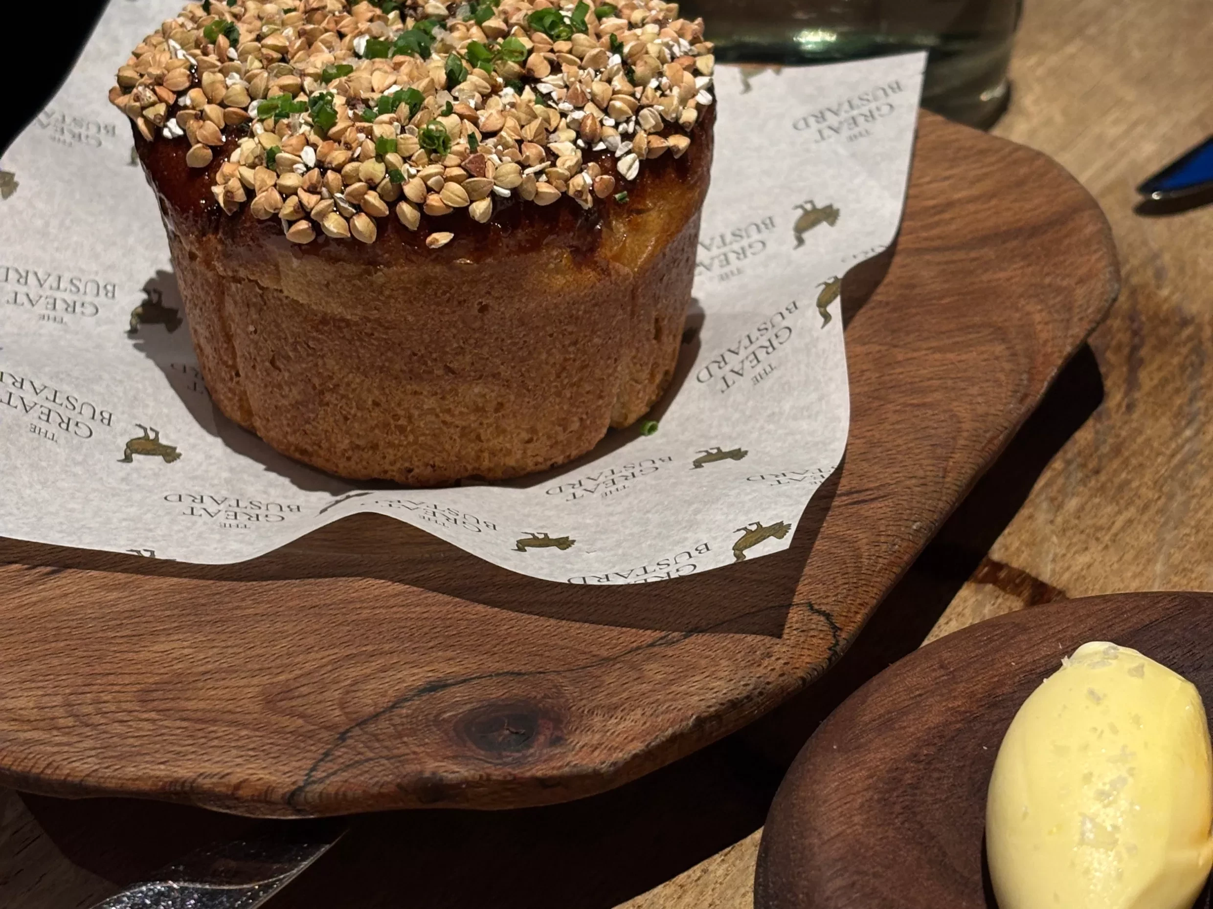 Then came some refined takes on pub classics. First, crab bites, but not the kind blitzed with breadcrumbs and mayo. This crab was freshly shredded, sat atop a base of crispy seaweed, drizzled in a rich, hollandaise-like sauce and finished with fish roe for a pop of saltiness. We were keen to try the restaurant's take of a sausage roll. A glossy pastry with black sesame seeds scattered over the top, adding a subtle nutty flavour for the flaky casing of the well-seasoned meat inside, served with Pommery Mustard. As much as they are elevated and refined, the dishes themselves are no less comforting- much like The Great Bustard itself.