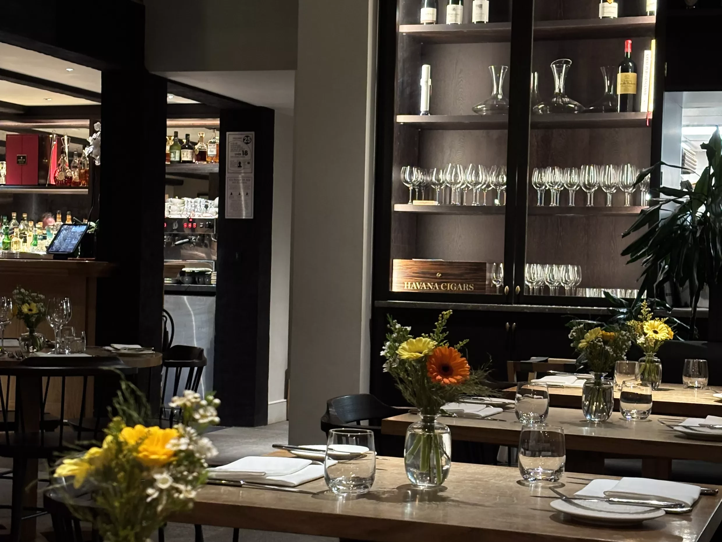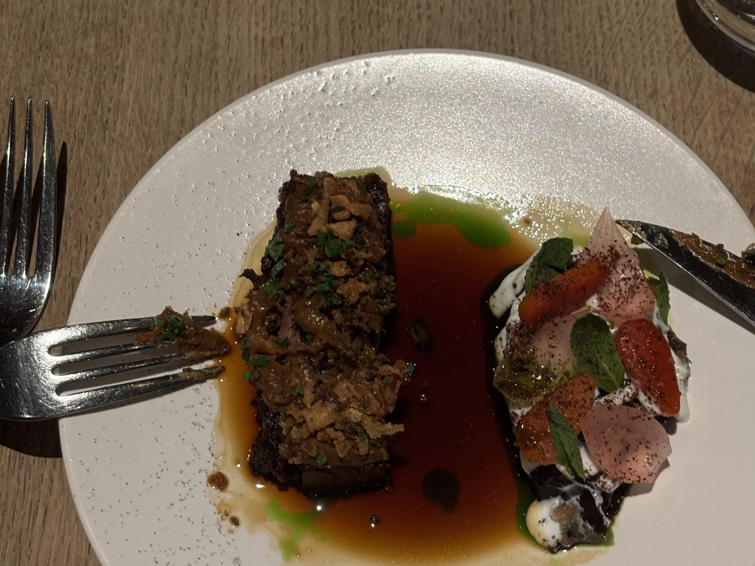 Our meal concluded with a Garden Mint & Chocolate Mousse and mint chocolate ice cream, a dish that ignited memories of sharing Vienetta Mint around a table as a child. As nostalgic as the flavours were, they were delivered with a finesse that elevated them beyond memory, a familiar comfort turned into something quietly sophisticated. We rolled into the cozy setting next door for a night cap with the locals, a glass of OTARDA, translating to ‘Great Bustard’ in Italian. A blend of Sangiovese and Cabernet Sauvignon, delivered straight from The Great Bustard's sister estate in Tuscany, Italy.