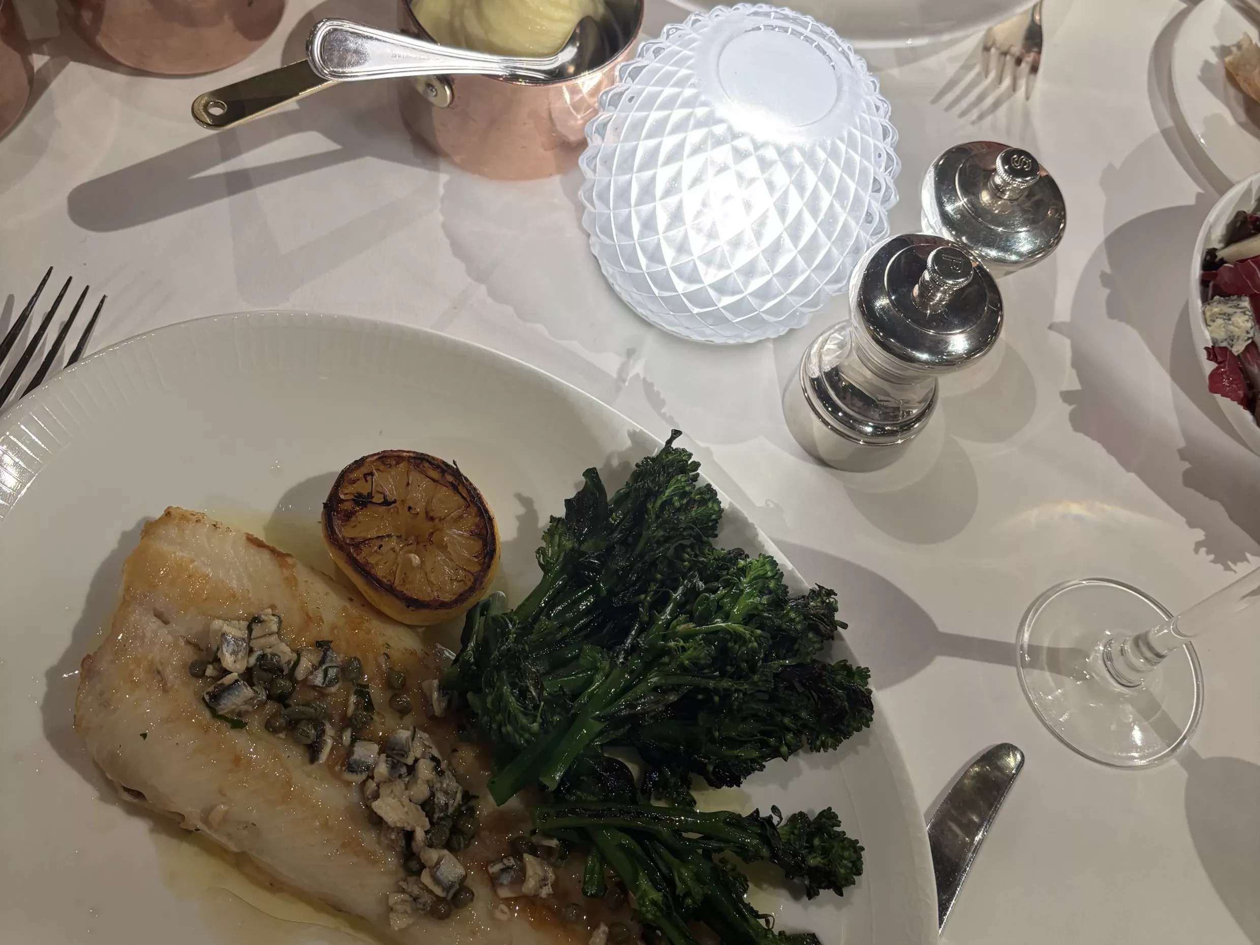 The main courses combine European classics and quality, British produce. After much deliberation, we agreed on the Dover Sole a la Meunière, served off the bone (you'll be pleased to know) and with an anchovy and tarragon butter. Perfectly flaky and moist with a golden exterior, not to mention a very generous portion size! To follow was the Merryfield Duck Breast, a juicy cut in a sweet glaze that perfectly complemented the meat. It was presented on a bed of beetroot, celeriac, cherries, blackberries and caramelised walnuts. As always, a few sides were in order- a bowl of silky, mashed potatoes, and a salad of pear, endive, stilton and walnuts. As you can imagine, we savoured every bite.