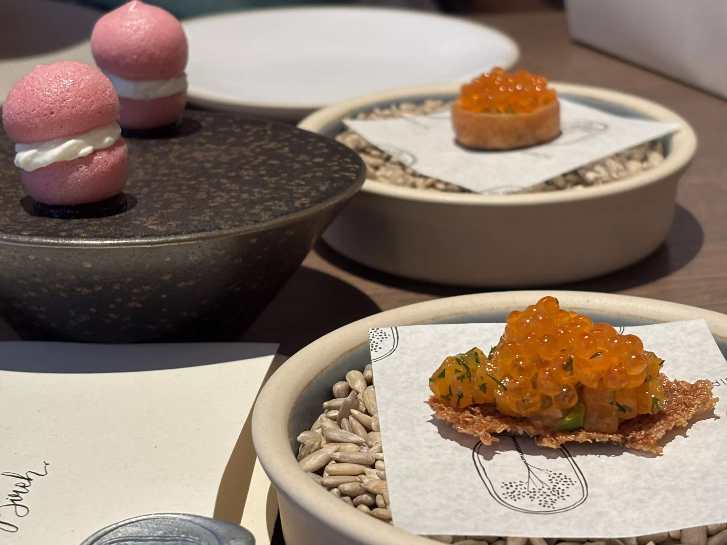 First came three, immaculately-presented delicacies, otherwise known as amuse-bouche. A silky fois gras on a crisp bed of golden chicken skin, chalk stream trout topped with bursts of salty roe, and a bright pink beetroot and horseradish meringue that melted in the mouth with sweet and sharp notes in harmony. We knew that this restaurant had won multiple awards (AA London Restaurant of the Year being just one) however, we really weren't expecting the standard to be set so high by our first three bites.