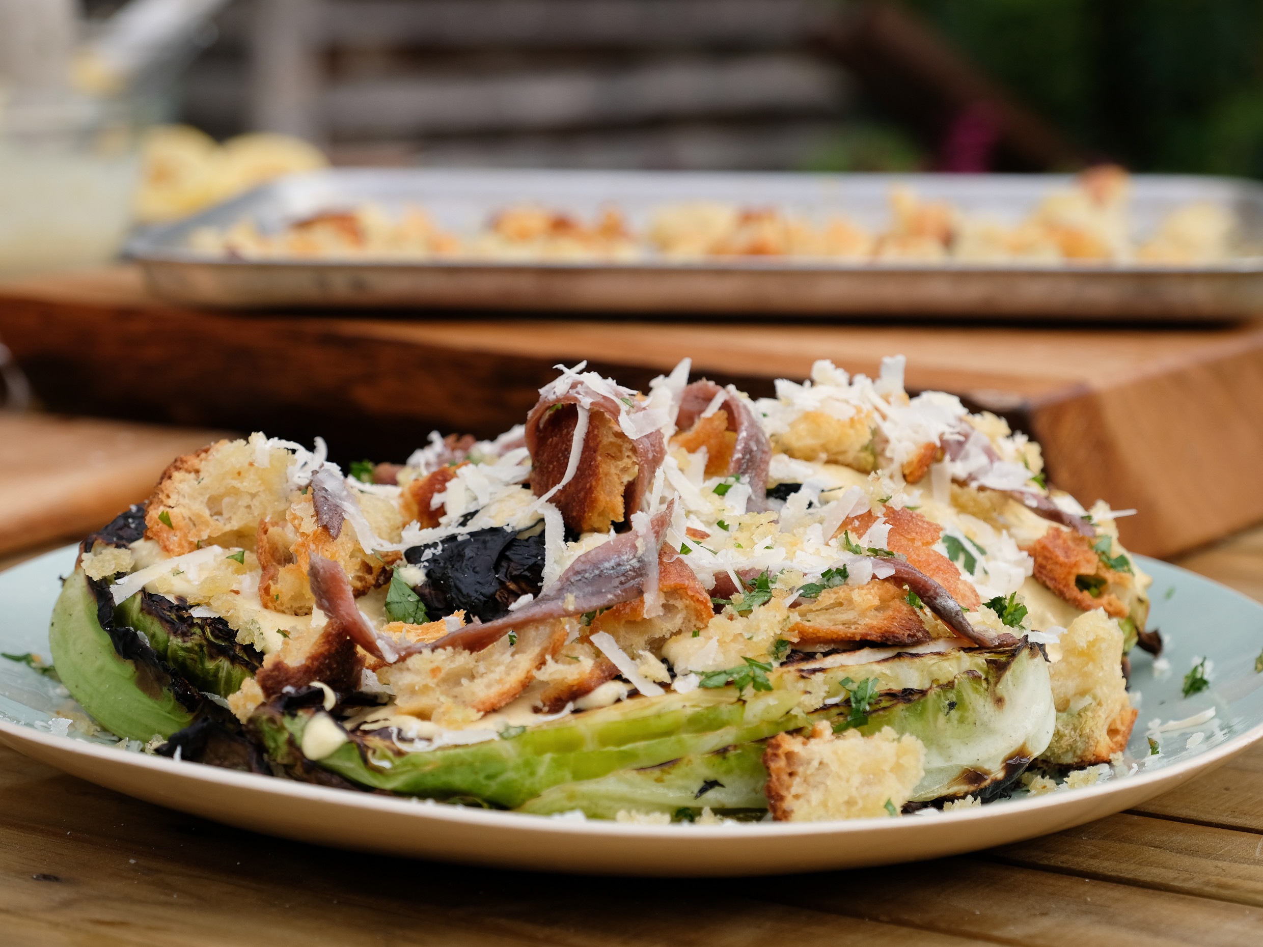 - Cut the cabbage in half, but leave the core so each side cooks in one piece. What you’re left with is two beautiful faces of the cabbage to leave on the grill for a top-class side salad.