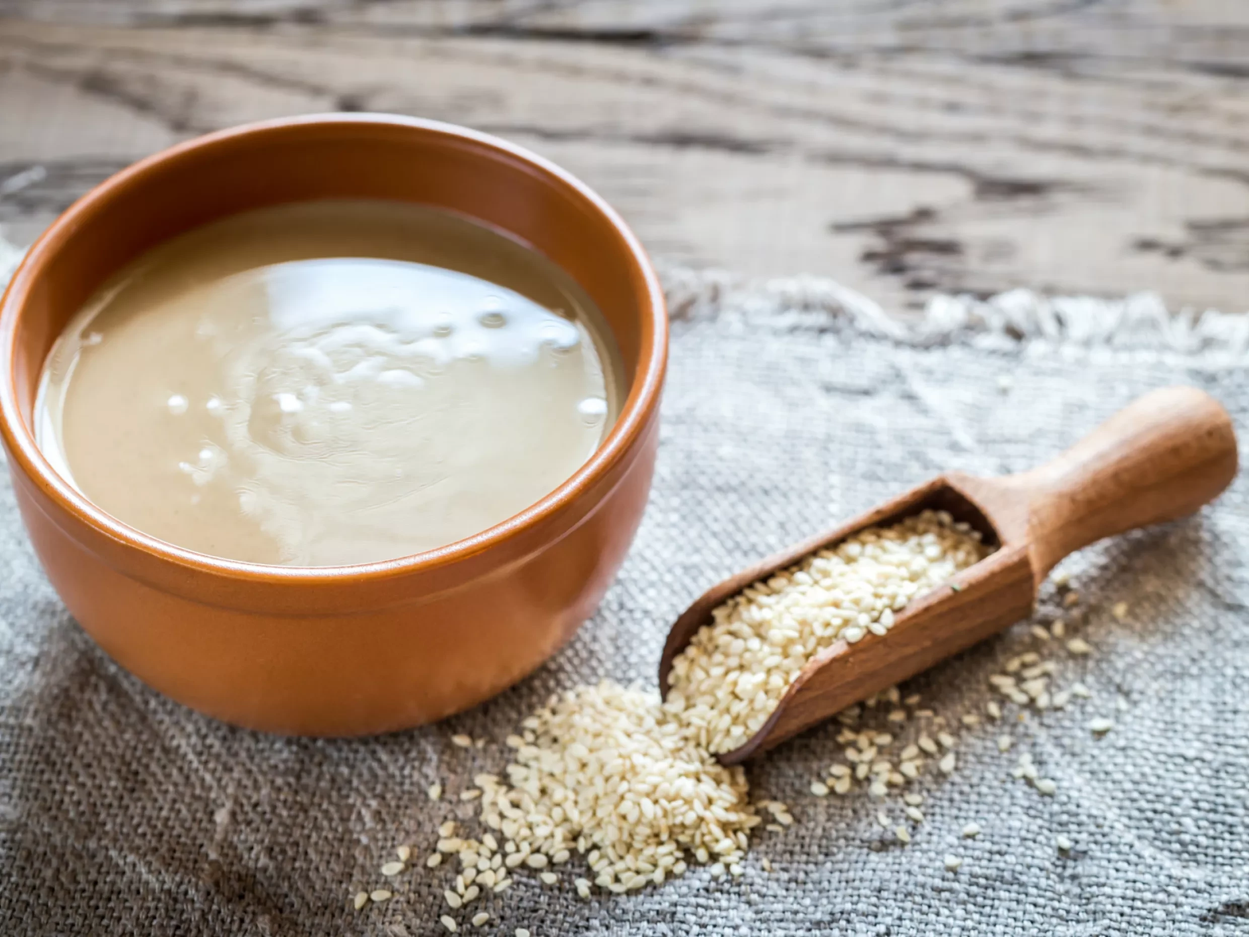 - Add oil to the sesame seed paste. With the food processor running on low, pour 3 tablespoons of oil through the pour spout, stopping the food processor to scrape down the sides of the bowl with a spatula from time to time. Process for about 3 minutes, until the mixture is smooth. If the mixture looks dry, add 1 more tablespoon of oil and process for 1 minute, until it achieves a pourable, creamy consistency.