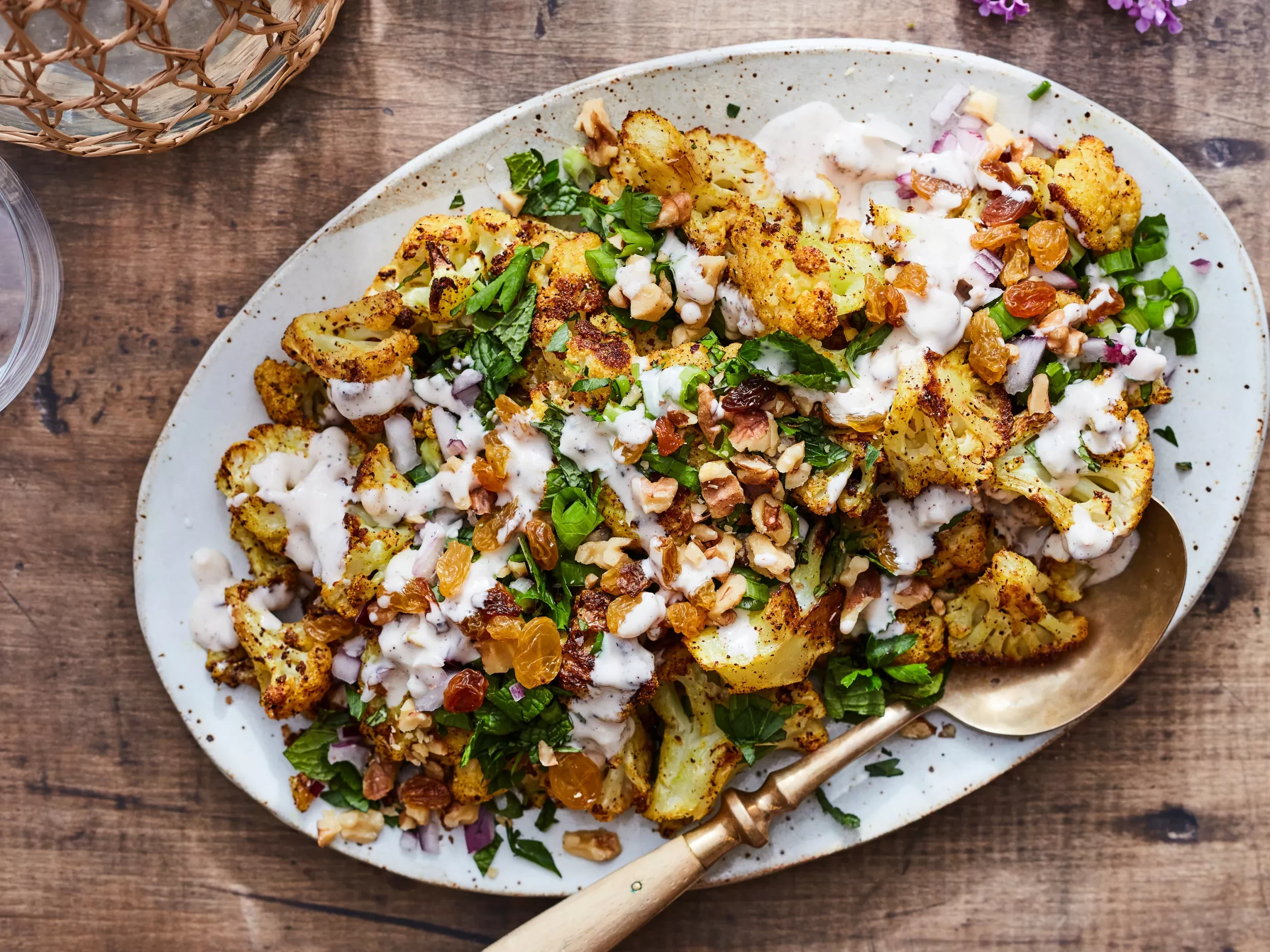 Tahini mixed with lemon and yogurt adds up to a bright, creamy sauce that acts as the perfect foil to grilled, caramelized cauliflower. A flurry of fresh herbs, walnuts and sultanas prove that tahini is a neutral flavor booster that plays well with herbaceous, nutty and sweet counterparts, too.