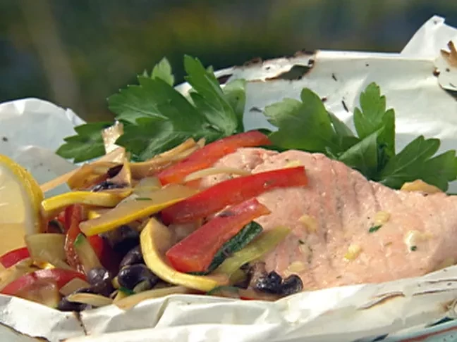 To celebrate her friend's baby shower, Ina Garten cooks a delicious baked salmon and prepares some very creative table decorations!