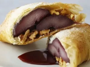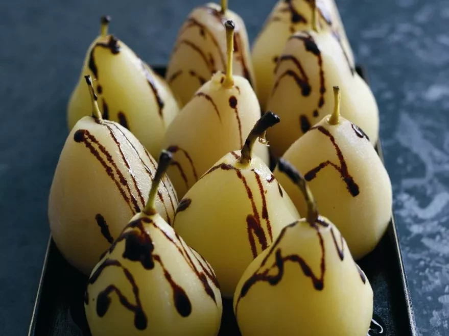 An elegant dessert of pears poached Châteauneuf du Pape by none other than Michel Roux.
