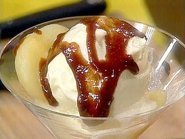 An elegant dessert of pears poached Châteauneuf du Pape by none other than Michel Roux.