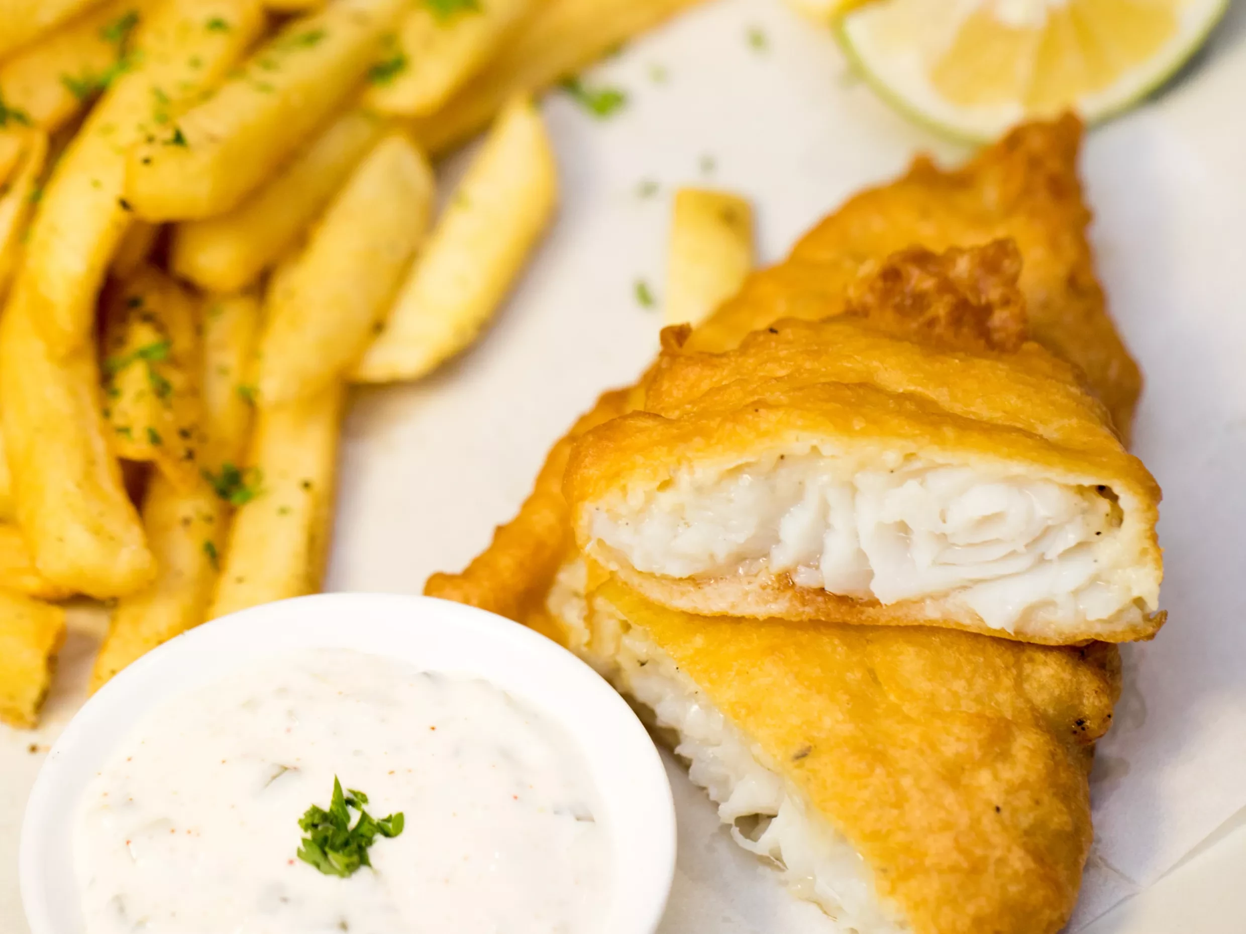 Lager Battered Fish and Chips with Minty Mushy Peas