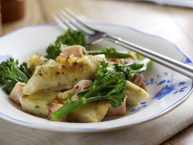 Tenderstem Kopytka (Polish Gnocchi) with Shallots and Polish Ham