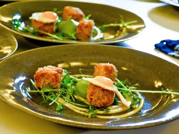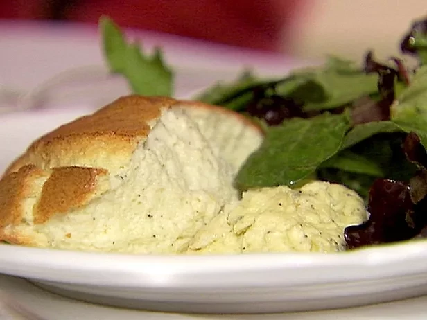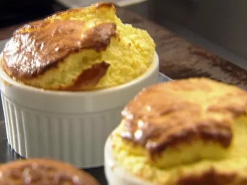 Michel's beautifully light cheese souffle with a poached egg hidden inside!