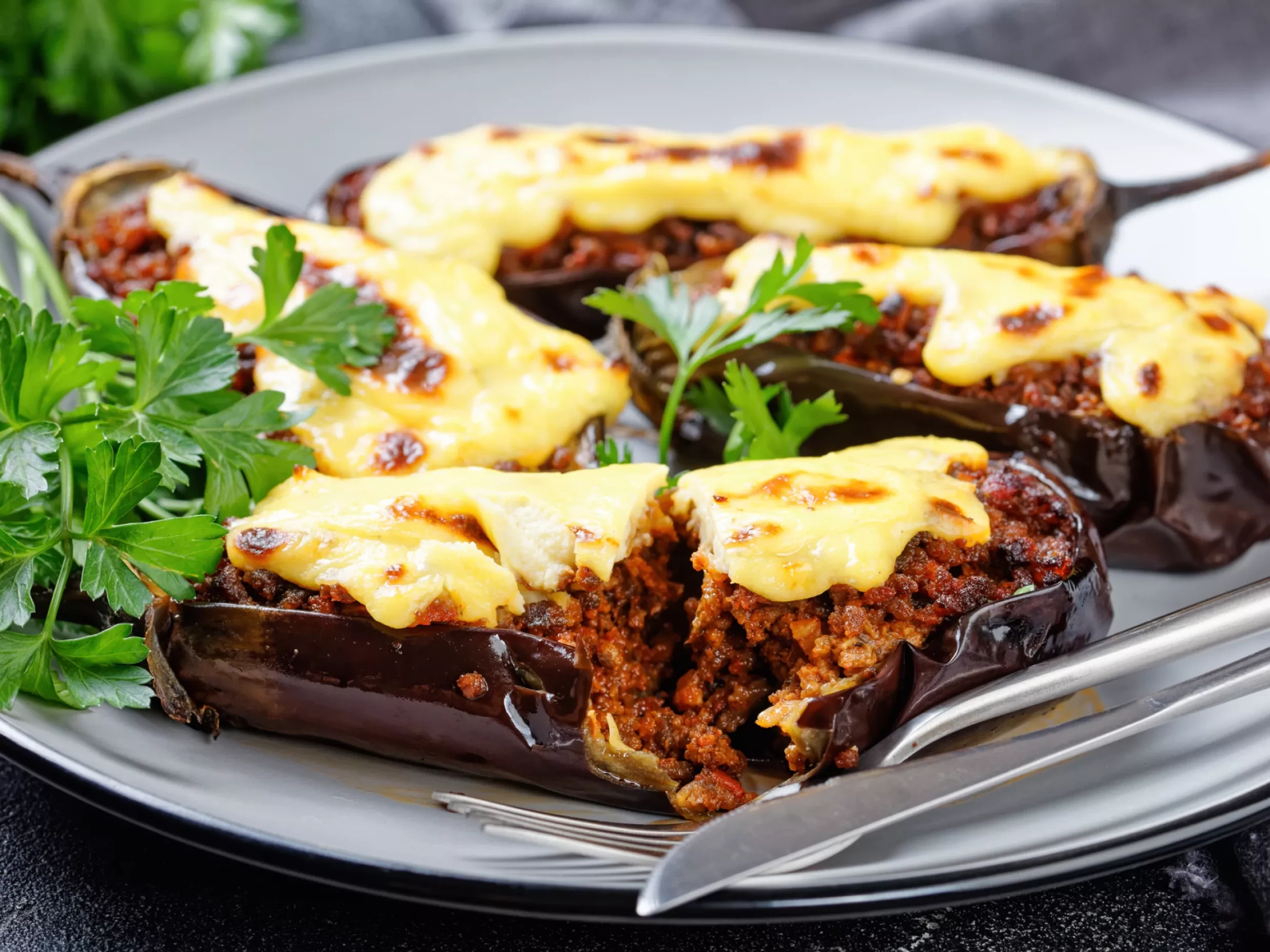 Papoutsakia, or “little shoes”, may be the ultimate comfort food! Roasted aubergines stuffed with rich, spiced beef sauce, topped with creamy béchamel and cheese, and baked until irresistibly golden.