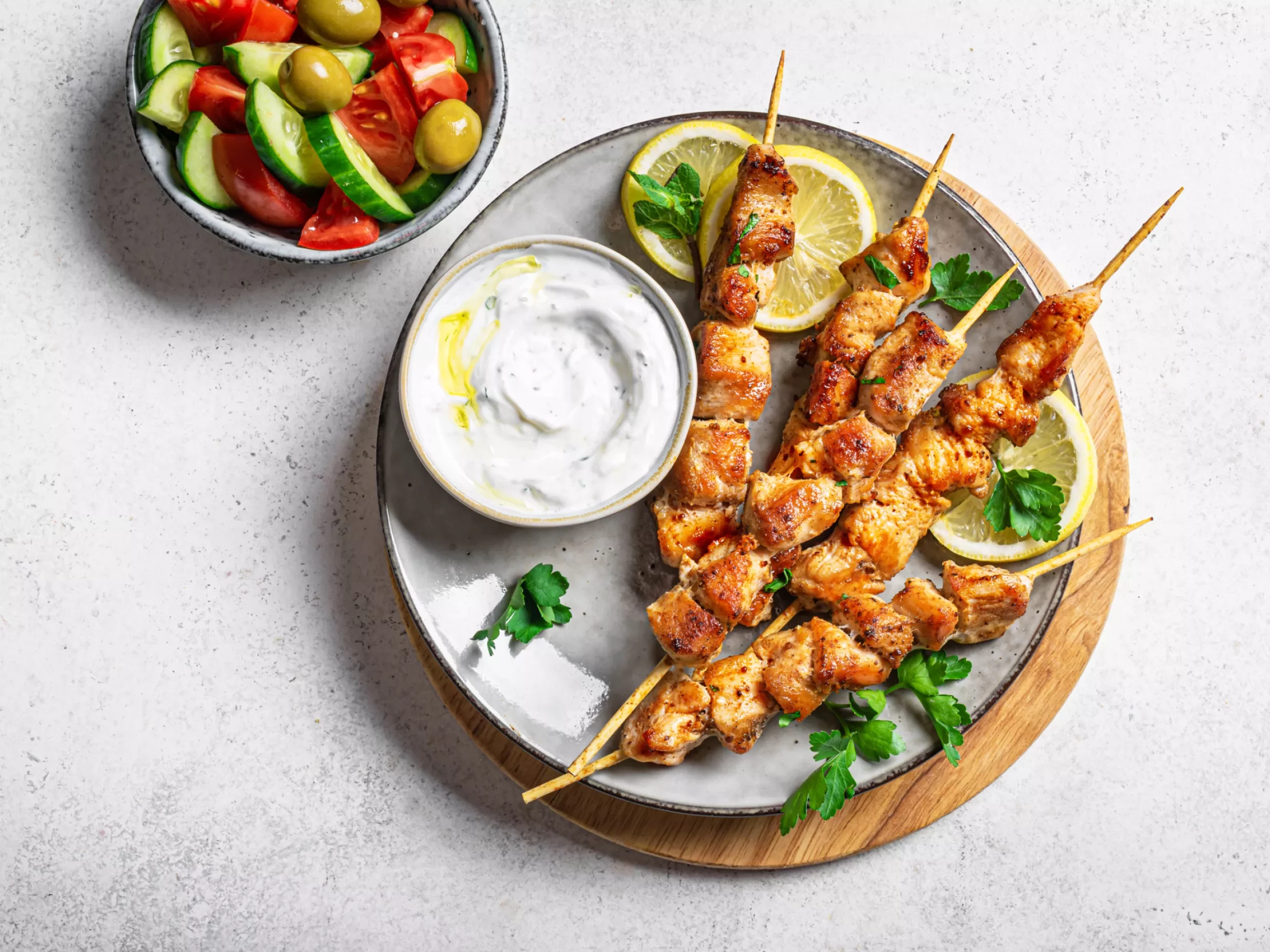 Featuring a combo of classic flavours and ingredients, our Greek dishes are a treasure trove of tantalising tastes, including authentic chicken & pork souvlaki, luscious lamb kebabs with tzatziki sauce, and a gorgeous Greek gazpacho bringing Santorini sunshine to your table. For lighter bites, a Greek orzo and grilled shrimp salad with mustard-dill vinaigrette, or traditional tyropitakia crispy cheese pies are a true taste of Athens and beyond. Got a sweet tooth, the delectable apple baklava, or walnut sugar biscuits known as kourabiedes are mouthwateringly moreish!