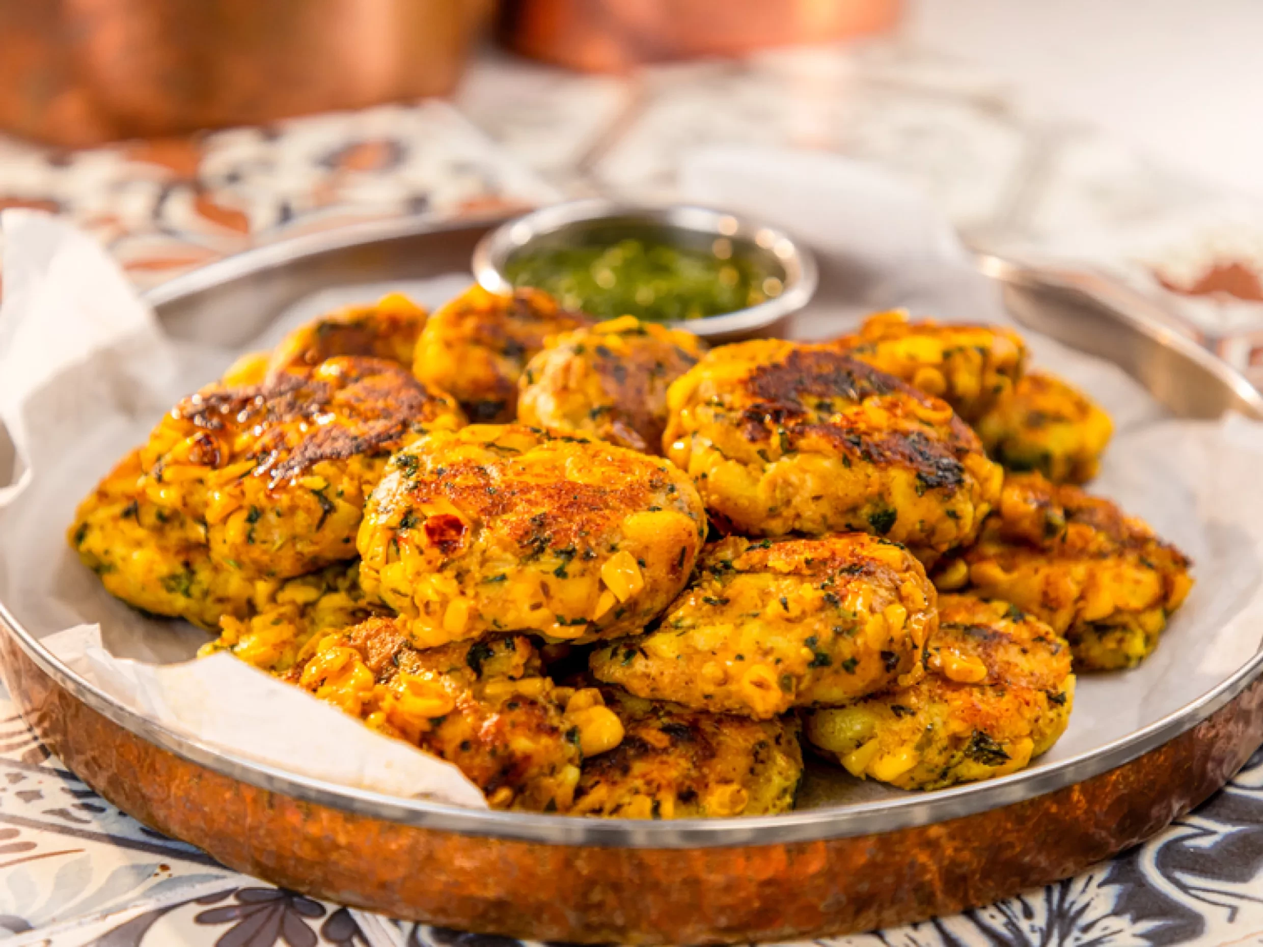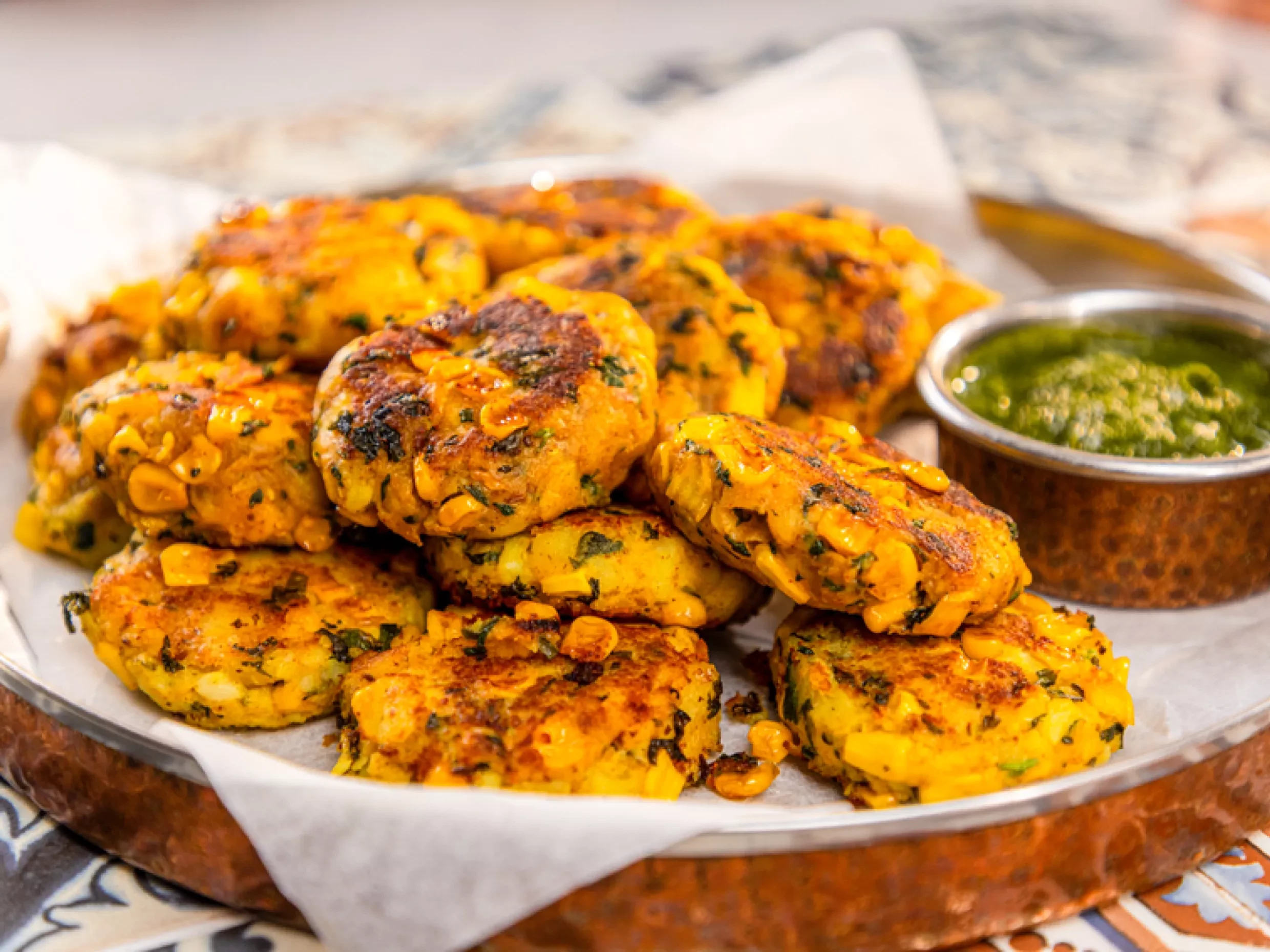 Asma grew up in Calcutta, where no birthday party or picnic was complete without a vegetable chop. Potato-based chops, usually covered in breadcrumbs and deep-fried, were a popular street food in Bengal. The origins of potato and vegetable combinations mixed together to form a cylindrical croquette-shaped chop have often been traced to the Portuguese influence in India, not least because they introduced potatoes to India in the early seventeenth century. Tikki are a flat, disk-shaped version of potato chops and are more widely available in India. Often made on large tawas on carts in the street, they are served piping hot with chutney. This recipe combines two of Asma's favourite things: potatoes and corn!