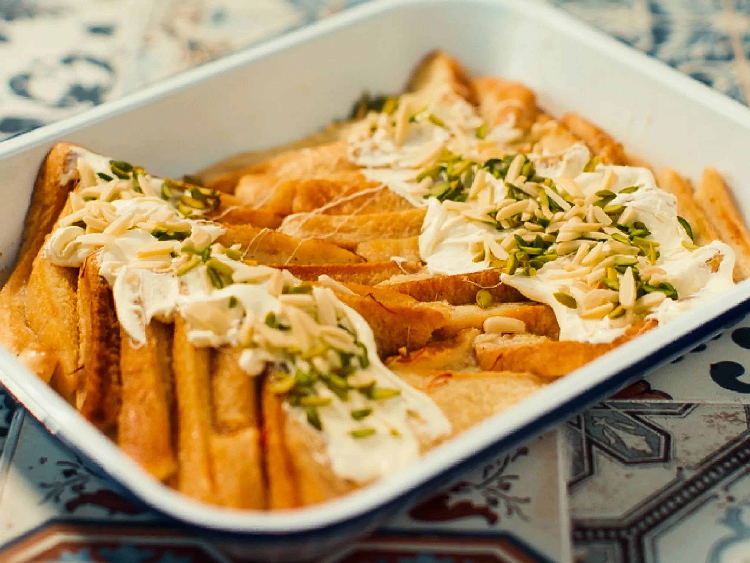 - Melt the butter and oil together in a non-stick frying pan or skillet over a medium heat. Fry each bread triangle, one-by-one, until golden-brown then place straight into the saucepan of milk for 10-15 seconds. Layer the bread in a serving dish (about 30cm/12in long, oval ideally). Repeat until all the bread has been used.