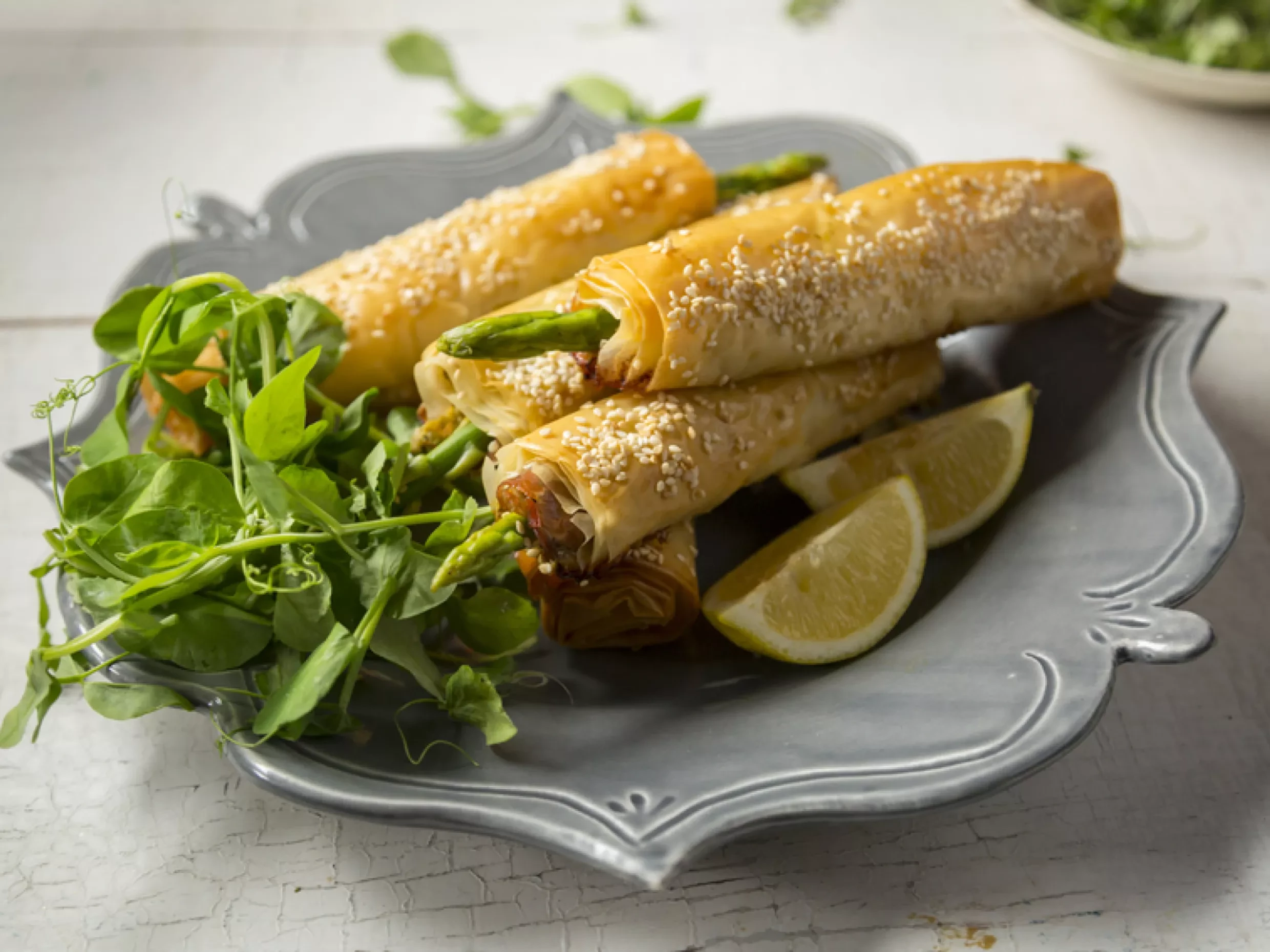Asparagus wrapped in layers of Parma ham, pesto, garlicky cheeses, and a light filo pastry- delicious.