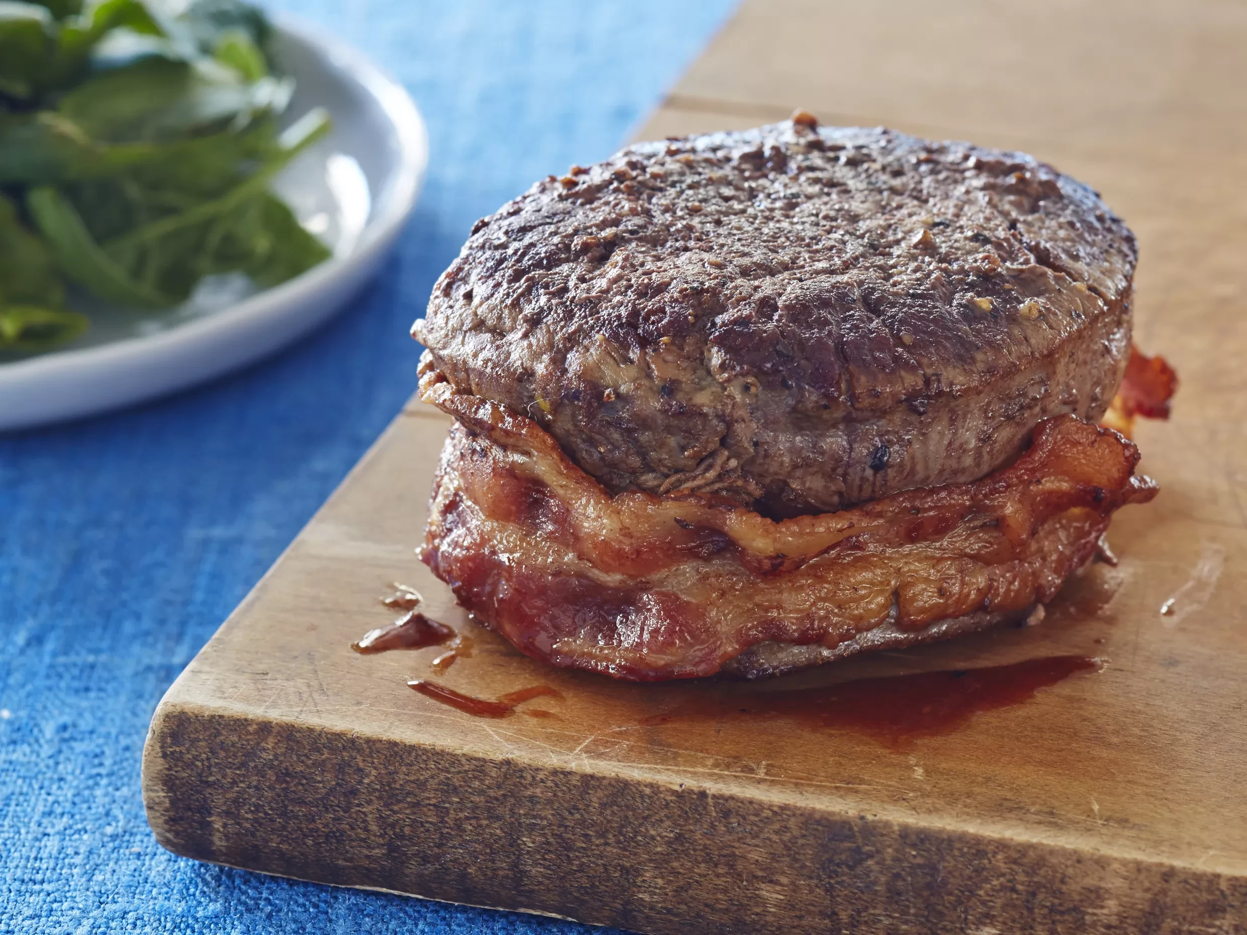 2. Generously salt and pepper both sides of the steak. Wrap the steak with the bacon and secure with a toothpick.