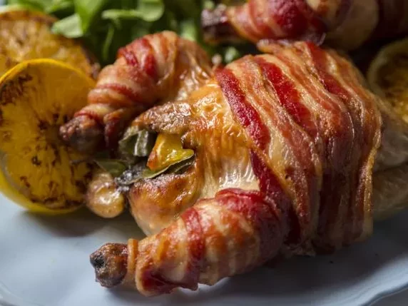 4. Wrap each chicken in bacon and place in the fridge till you are ready to roast them.