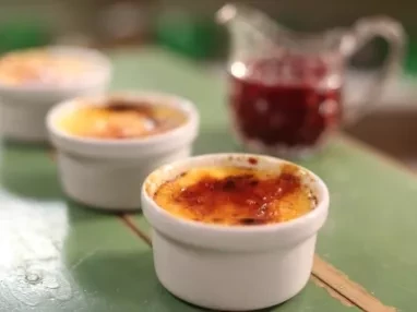 3. For the blackberry sauce, place the blackberries and icing sugar in a food processor. Turn on until a smooth puree. Pass through a fine mesh sieve to remove any pips. To serve, sprinkle caster sugar over the baked custard and caramelise with a blowtorch. Serve with blackberry sauce.