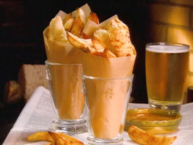 Baked fish 'n' chips with honey vinegar