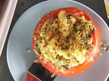 Season the inside of the tomatoes with salt and pepper. Then stuff each one with as much mac and cheese as you can, 1/4 to 1/2 cup.