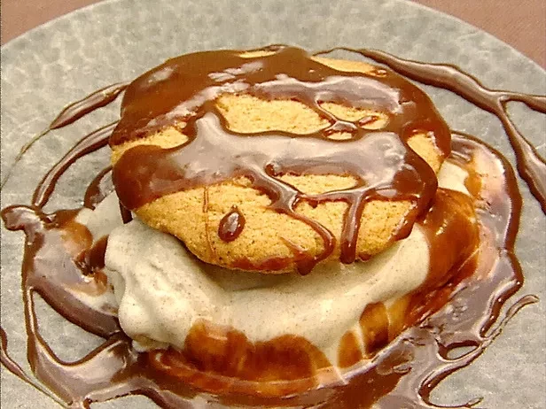 4) Invert ice cream onto feuillantine disks. Place ice cream "cake" on the plates and cover each with 2 tablespoons of the bananas.