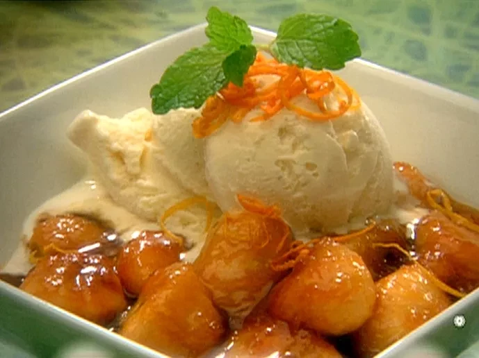 3) Serve the bananas in shallow bowls drizzled with the caramel pan sauce. Top with orange segments and a scoop of vanilla ice cream. Garnish with a sprig of mint.