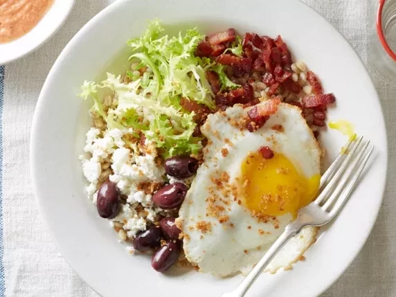 Build the bowls: Divide the barley evenly among 4 bowls. Top each with neat rows or piles of bacon, frisee, goat's cheese, olives and sauce (leave room for the egg). Top each with an egg, some sauce and a sprinkling of toasted breadcrumbs.