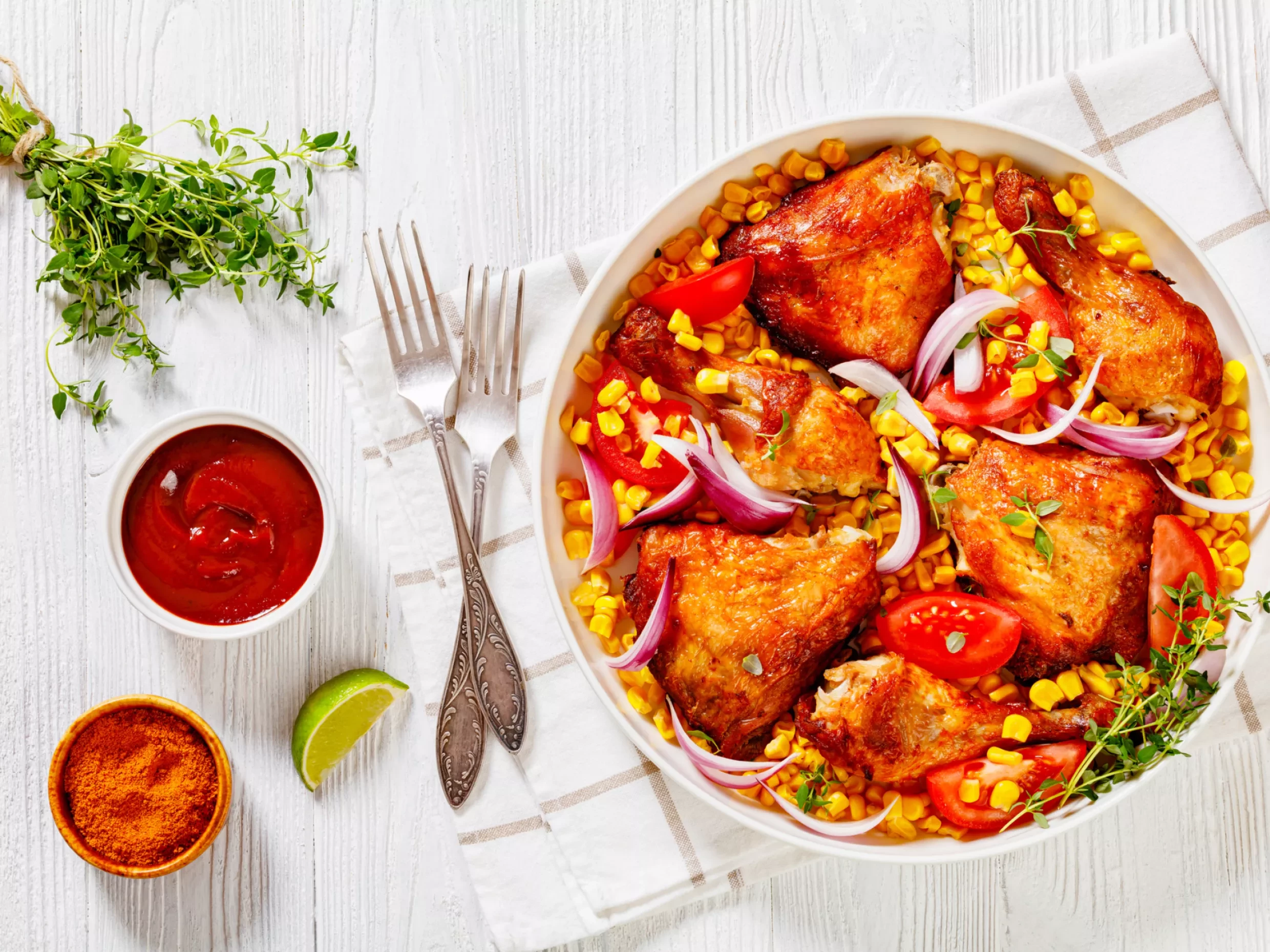 This BBQ chicken thighs recipe takes your grill game to the next level with bold flavours and exotic ingredients. Marinated in a zesty blend of ginger, lemon, and chili, the thighs are grilled to perfection, then glazed with a sweet-and-spicy mixture of plum jam, cayenne pepper, and cumin. The result? Tender, juicy chicken with a glossy finish that’s packed with layers of flavour. It’s an amazing option when cooking chicken thighs on a grill. Our barbecue chicken thighs are paired with a vibrant side of sweetcorn cooked with fresh tarragon, lime zest, chili, and red onion.