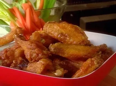 4. Toss the chicken wings in the seasoned flour until well coated, shaking off the excess flour. Fry in batches until golden brown, crisp and cooked through, about 13 minutes. Drain briefly on paper towels before adding them to the sauce and tossing them to coat while they are still hot.