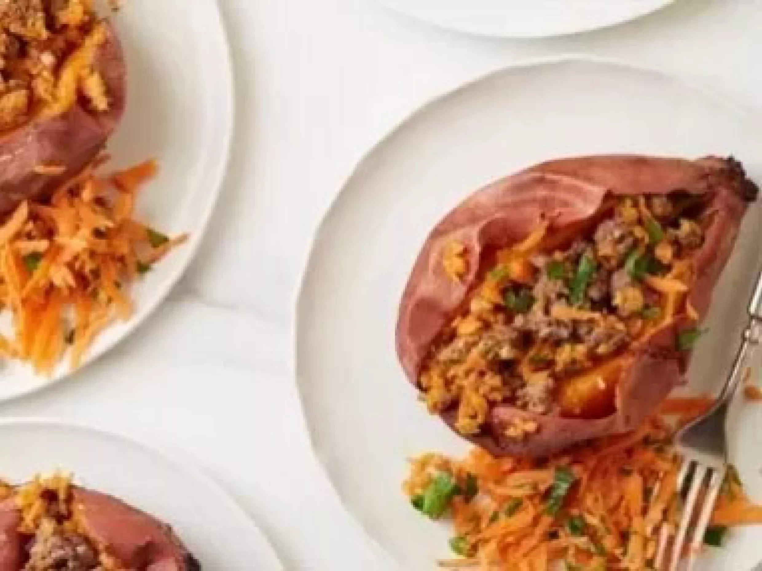 Our ground meat and sweet potatoes recipe is ridiculously tasty and easy to make at home. Start by microwaving or roasting your sweet potatoes until they’re meltingly soft and caramelised. Meanwhile, sizzle onions, carrots, tomatoes, garlic and spices in olive oil, then add the beef and let it brown to perfection. Stir a dash of red wine vinegar, letting everything simmer until the mixture is rich and unctuous and smells amazing! Then all you have to do is combine the sweet potato flesh with your mixture and pop it all back into the jackets.