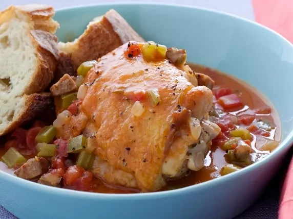 Add the flour, stir 1 to 2 minutes, and then pour in the beer and let the foam subside. Stir in the tomatoes, stock, and hot sauce. Let the sauce thicken a bit, and then slide the chicken into the pot and simmer to cook through. Serve with warm crusty bread, or cool and store for make-ahead meal.