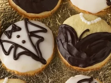 For tuxedo cookies: Set the cookies on a rack over a rimmed cookie sheet. Pour the white glaze over the whole cookie to cover; set aside to dry. Pipe a bowtie and tuxedo lapel with the chocolate icing.