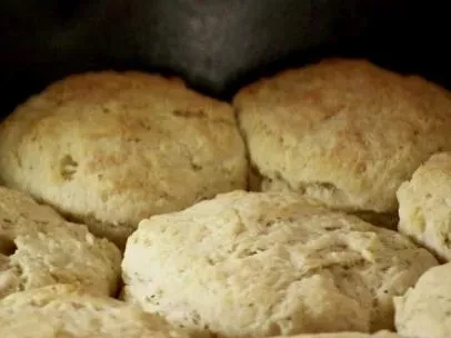 6. Cut out the circles with a biscuit cutter or glass. Place the biscuits in cast-iron skillets, then brush the tops with melted butter.