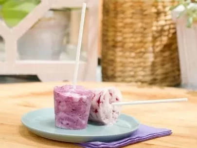 3. Gently insert a 6-inch lollipop stick into each cup. The thickness of the yogurt should help the sticks stand upright.