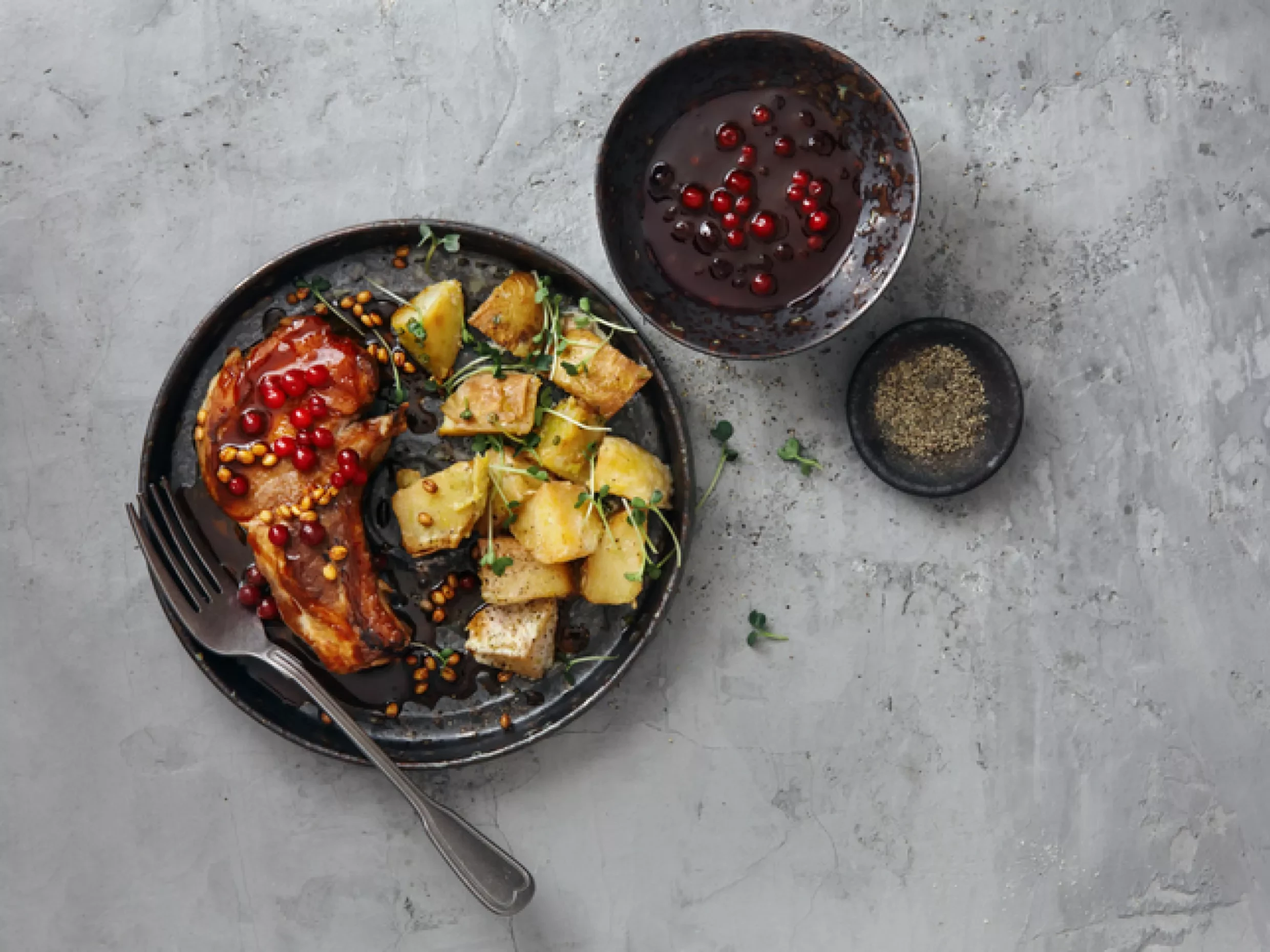 Whether you’re entertaining guests or want to elevate family mealtimes, this incredible boneless pork chop recipe is tasty proof that you can create gourmet gastronomy from the comfort of your own kitchen. Thick-cut pork loin chops are brined with salt, sugar, juniper berries, sage, and a hint of chilli flakes. After a quick sear in olive oil, the pork is finished in the oven and smothered with a glossy, ruby-red glaze made from dried cranberries, dry red wine, orange zest, and a sprinkling of sugar for the perfect punch.