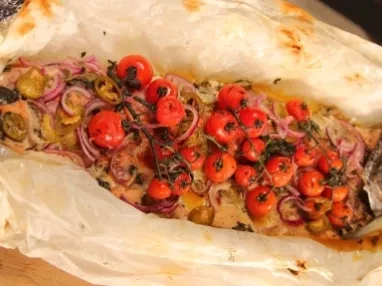 6. Open the parcel, move the salmon to a serving platter with fish spatulas.