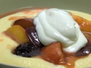 To serve, ladle polenta into bowls, top with honeyed fruits and garnish with a dollop of yogurt.