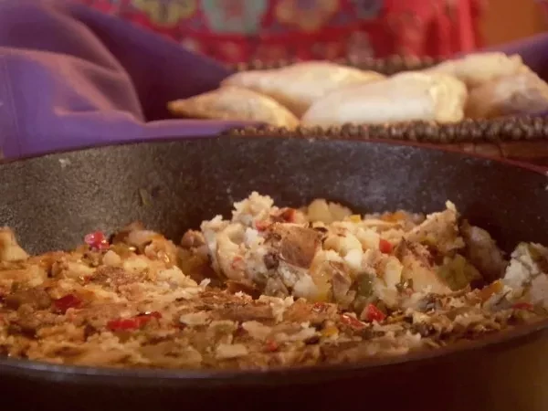 Place the hot potatoes on a cutting board and dice them into 1-inch pieces.