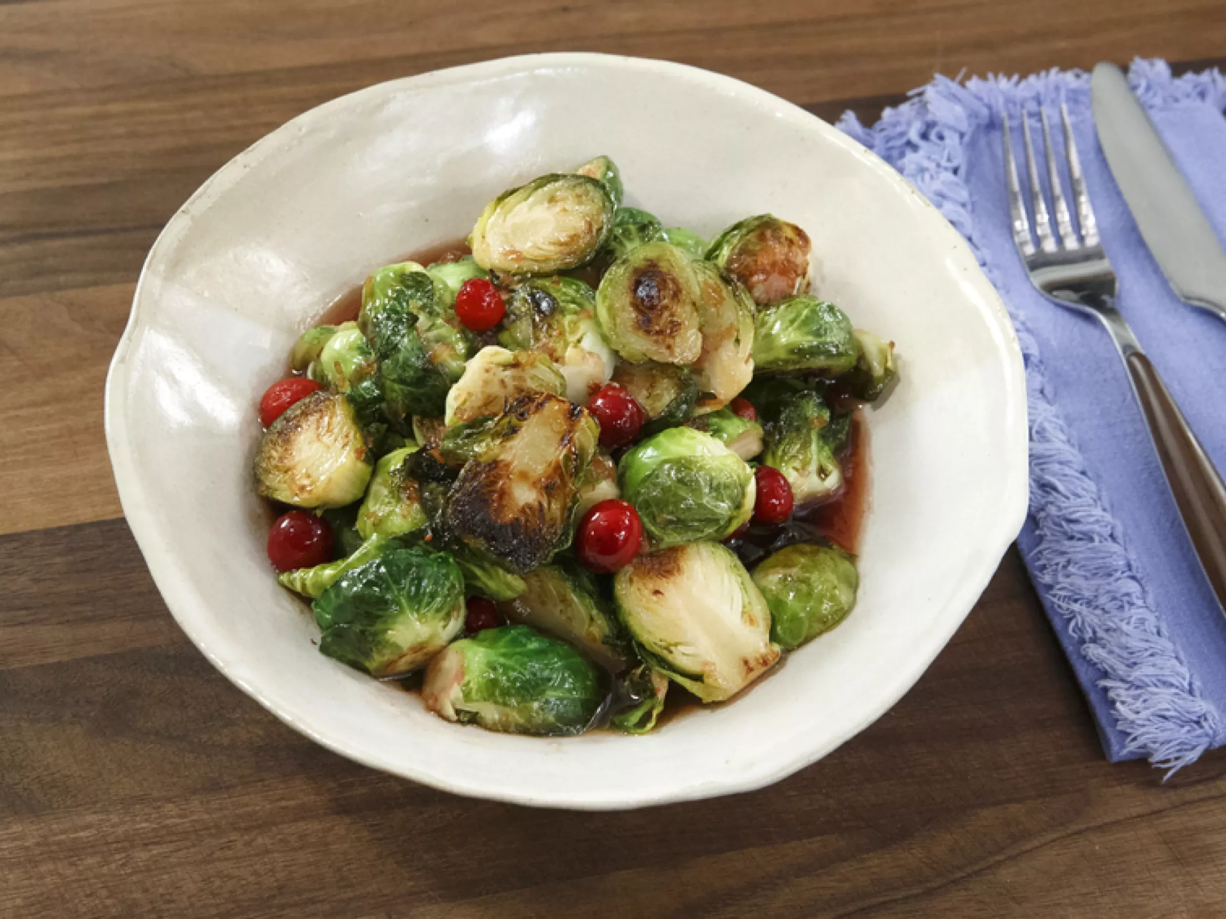 - Meanwhile, heat a large skillet over medium high heat. Add the remaining 3 tablespoons olive oil and warm another minute. Add the Brussels sprouts to the pan and cook undisturbed for about 3 minutes or until browned and beginning to soften. Season with the salt. Stir the sprouts and cook another 3 minutes to continue cooking. Stir again and cook another 3 minutes to brown evenly. Add the maple mixture to the pan and toss well to coat. Bring to a simmer to reduce the glaze slightly, another 2 minutes. Serve warm.