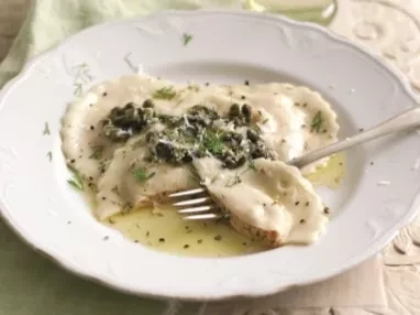 8. Drain the ravioli and divide between 4 plates. Serve with plenty of dill and caper butter.