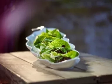 7. Lay the baby gem out on a plate, top with a few mint leaves followed by the cooked meat and sprinkle with spring onion, chilli and coriander.